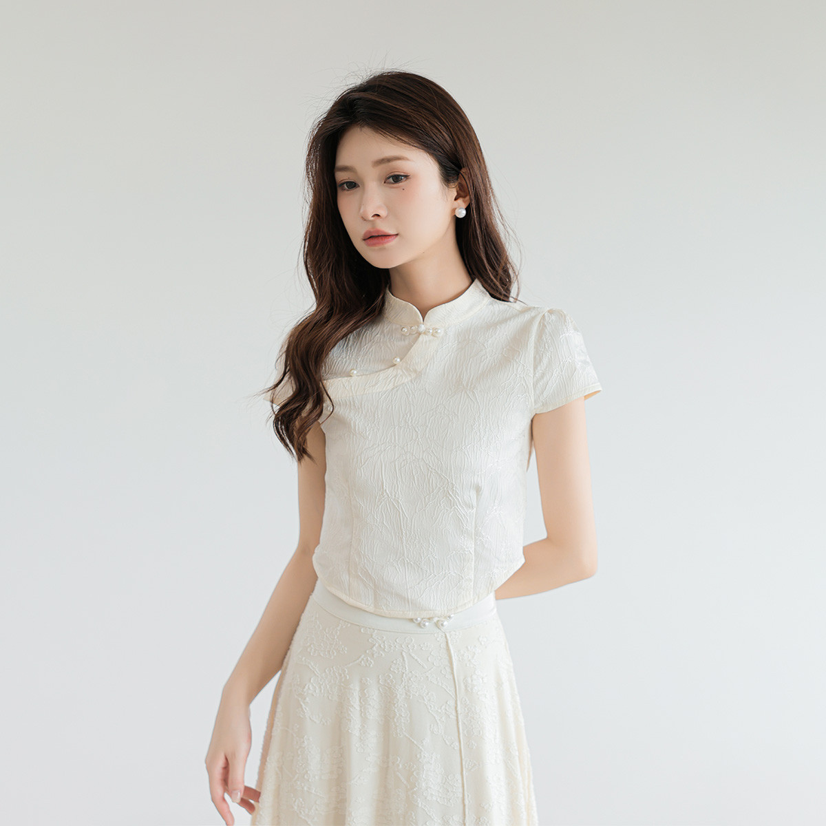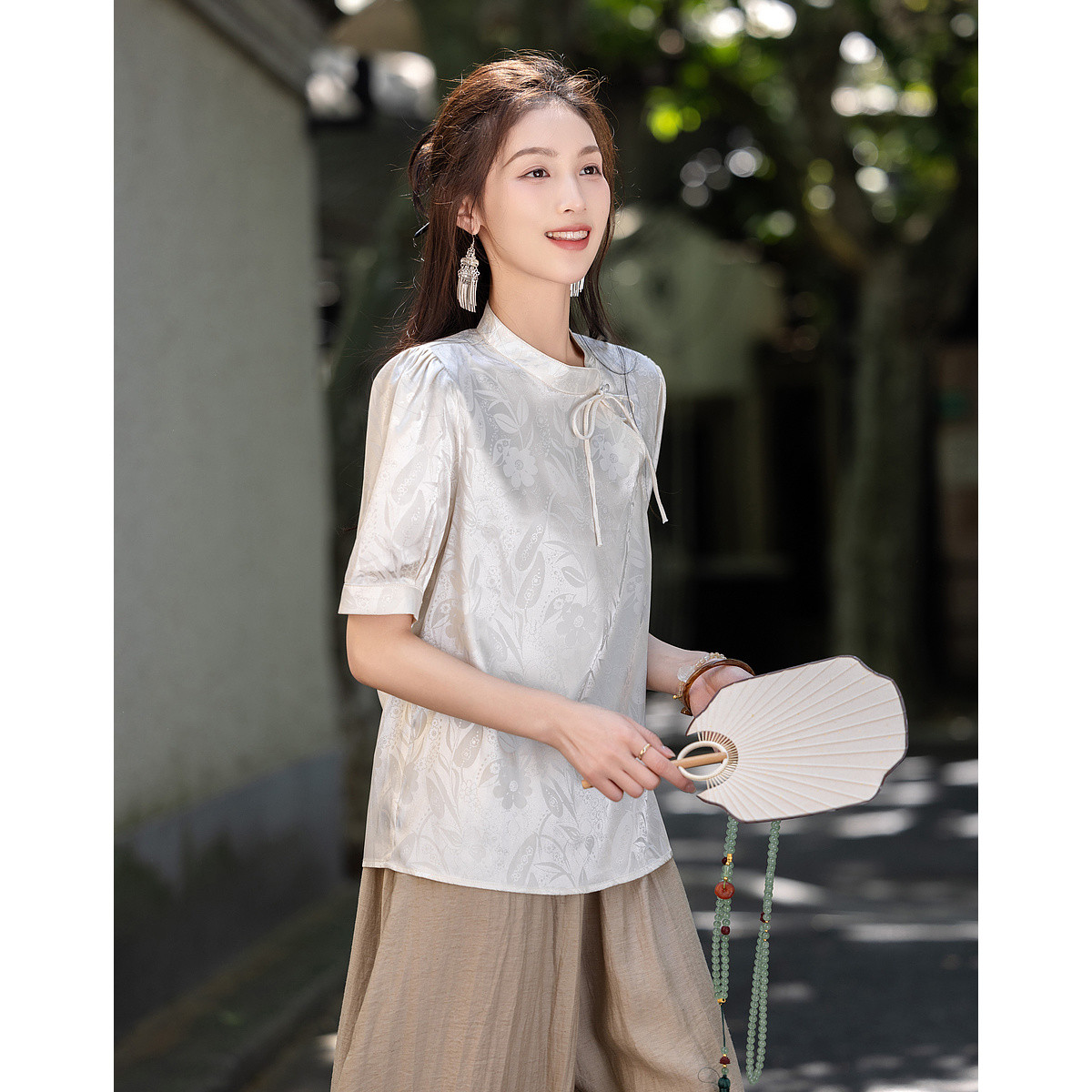 新中式国风缎面短袖立领斜襟上衣珍珠扣提花气质温柔衬衫女 203267