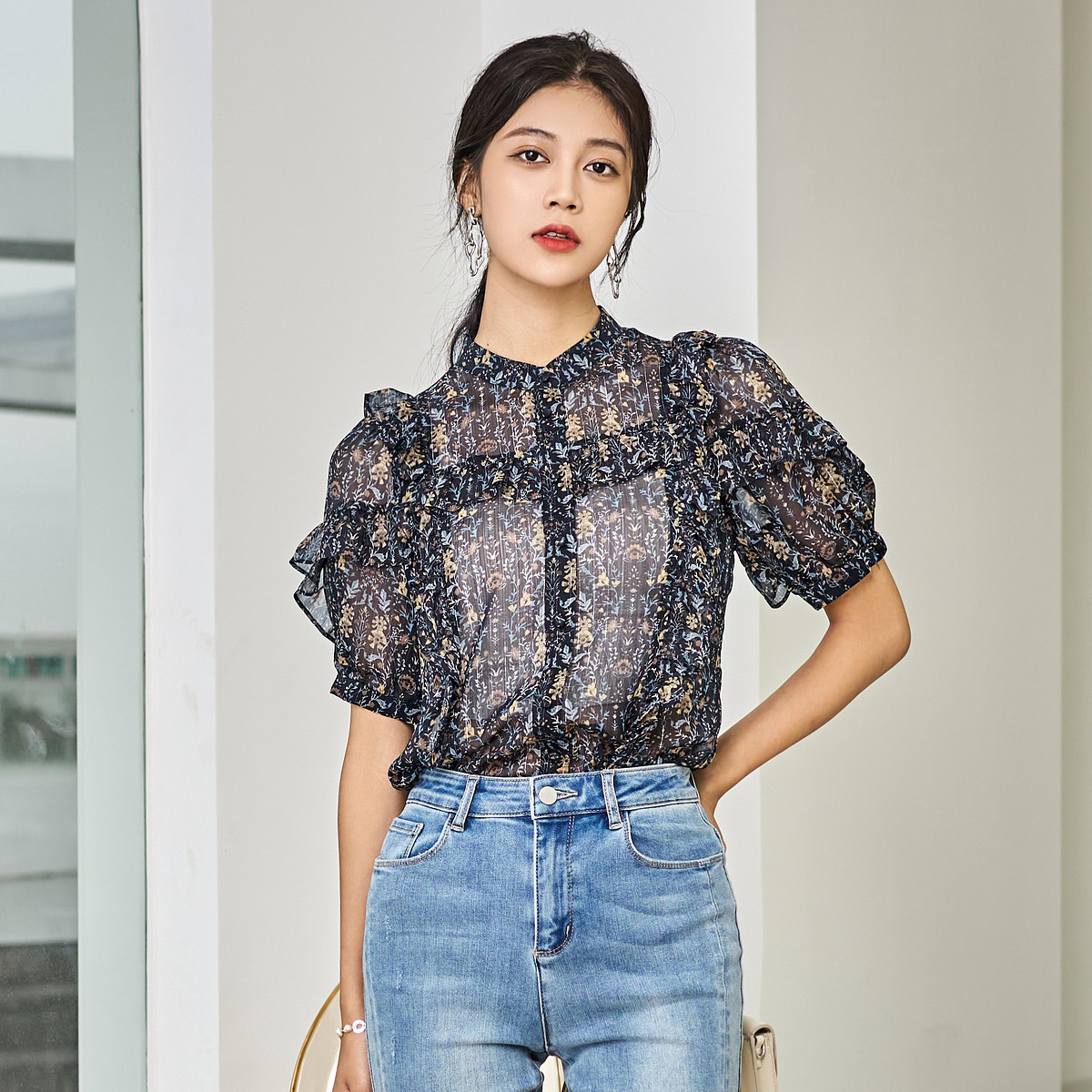 设计感复古碎花雪纺衫女夏季荷叶边拼接气质设计感通勤立领上衣女 793859