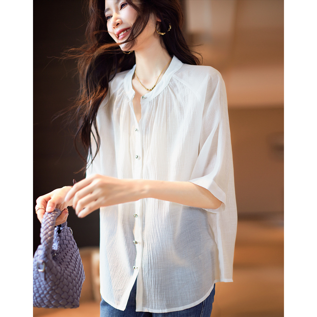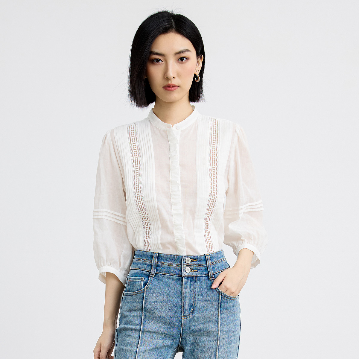 薄款七分袖衬衫女春夏花边镂空设计感立领衬衣休闲纯色通勤上衣女 707843