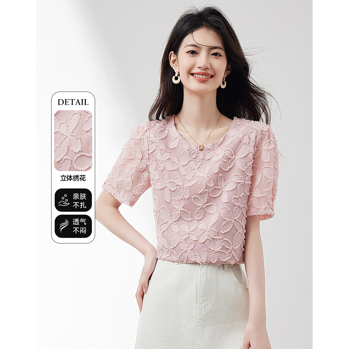新中式蕾丝T恤女2024夏季新款国风时尚百搭通勤显瘦薄款上衣 370968