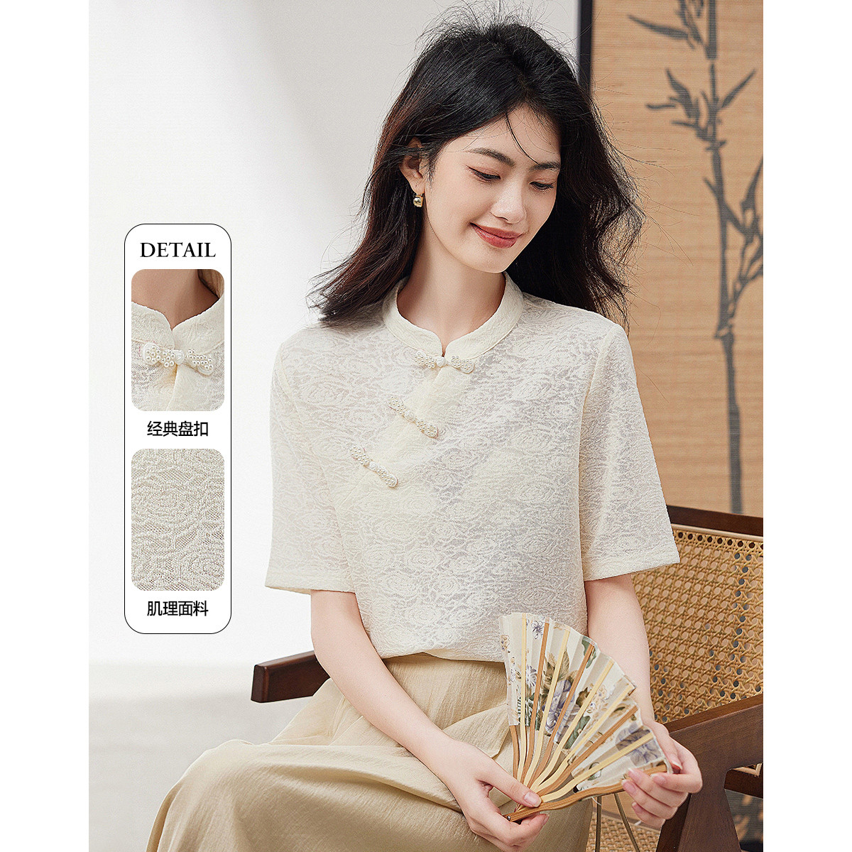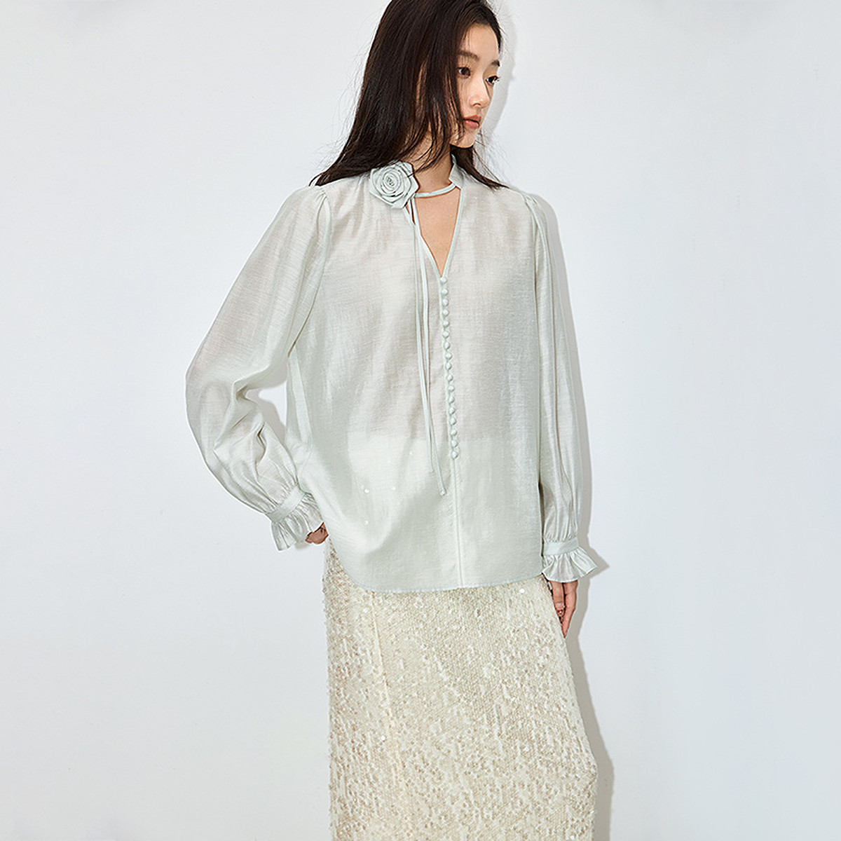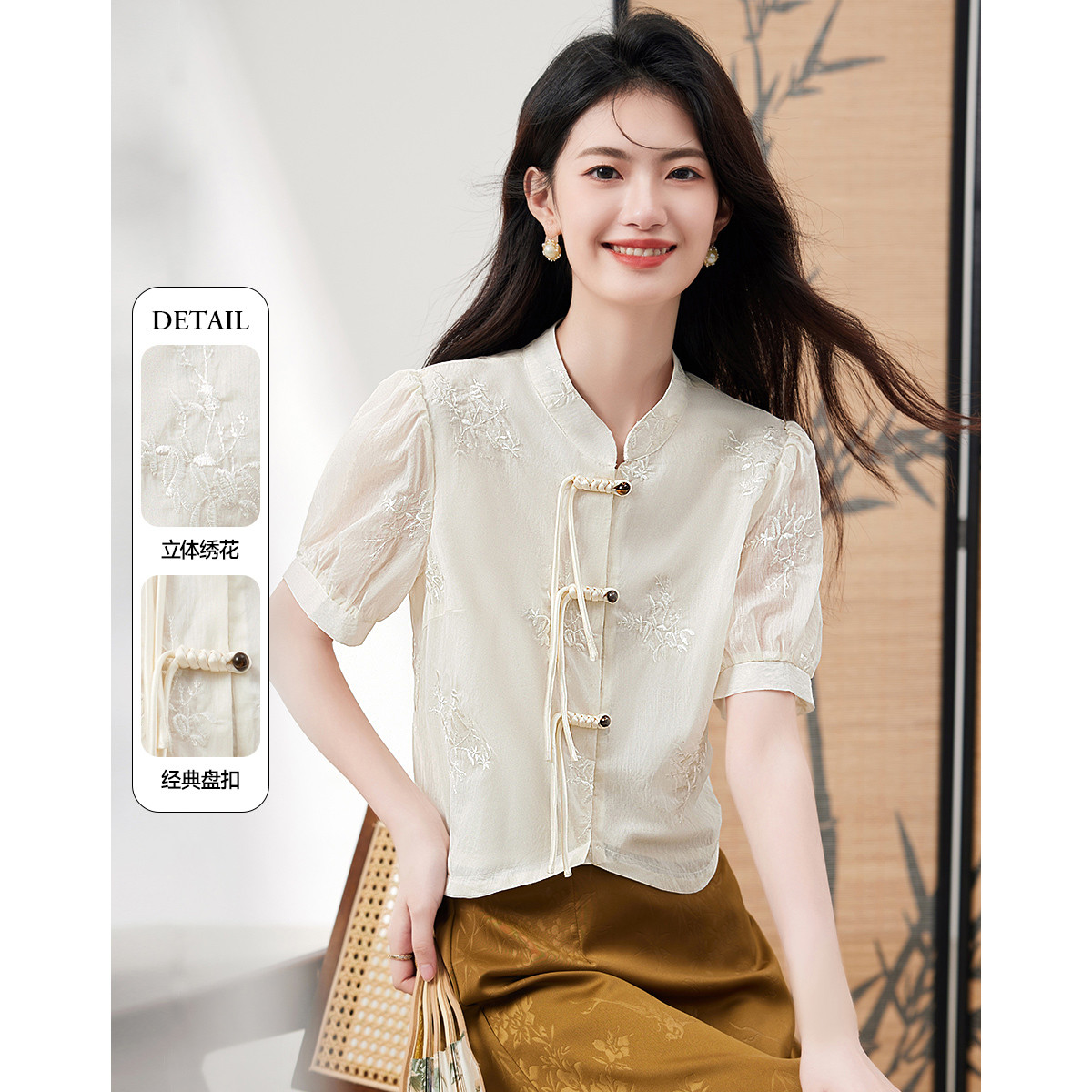 春季新中式国风衬衫女精致立体绣花图案立领设计轻薄衬衫 623835