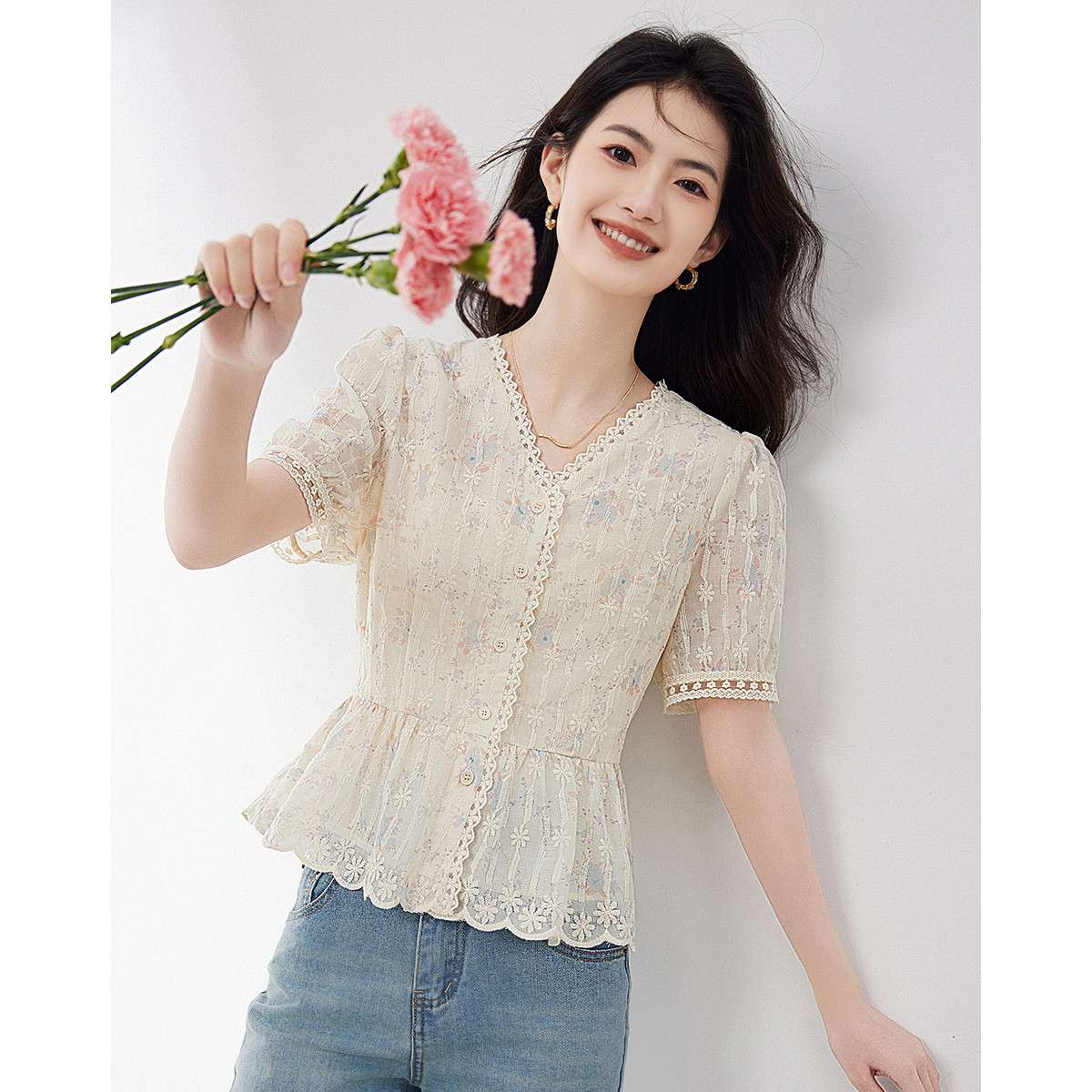 【V领花边显瘦衬衫女】2025夏新款气质通勤绣花短袖薄款上衣 050200