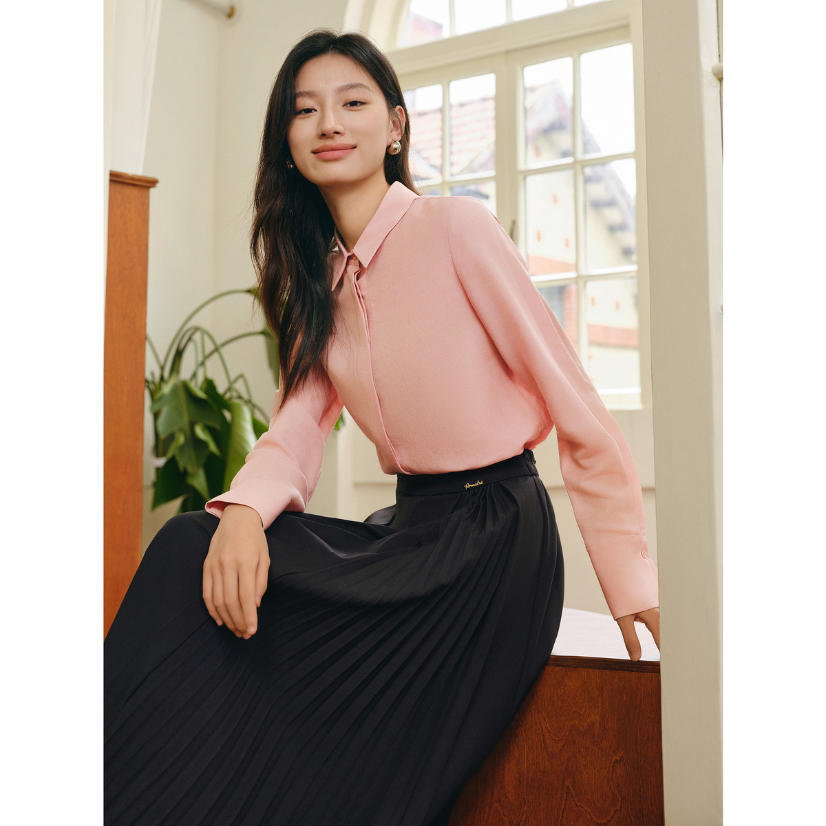 玖姿旗下安娜蔻系列桑蚕丝羊毛混纺简约基础衬衫女春季 423372