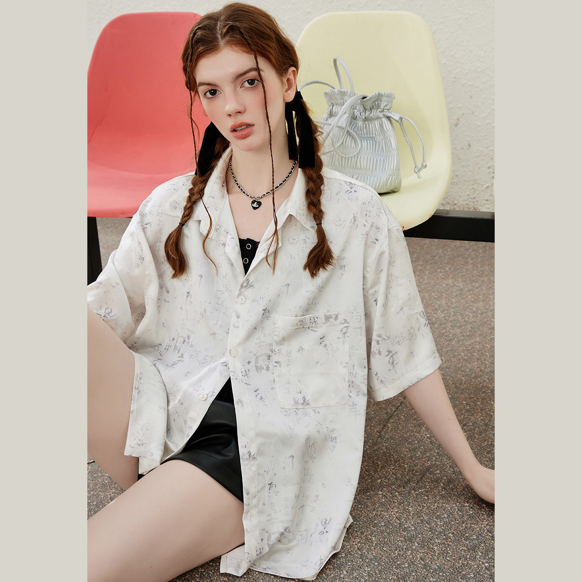 【时尚百搭】夏季百搭可拆卸蝴蝶结满印直筒衬衫女 083546