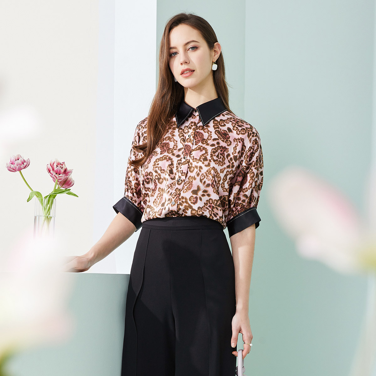 商场同款秋季野性豹纹印花撞色领宽松式5分袖衬衣 334943