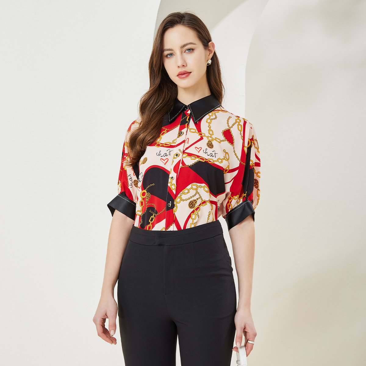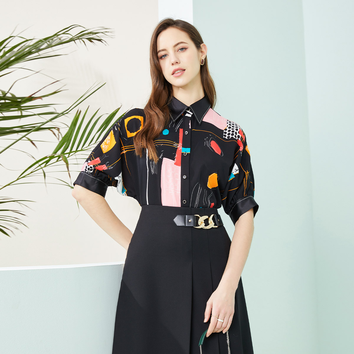 商场同款秋季赫本风法式印花优雅撞色宽松烫钻5分袖衬衣 590303