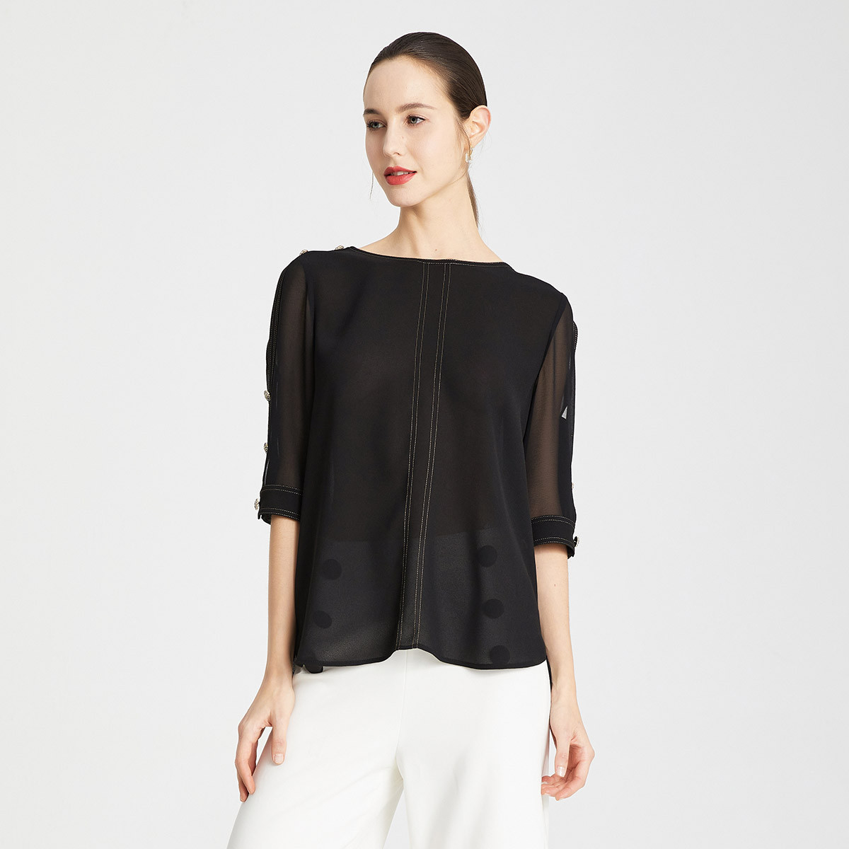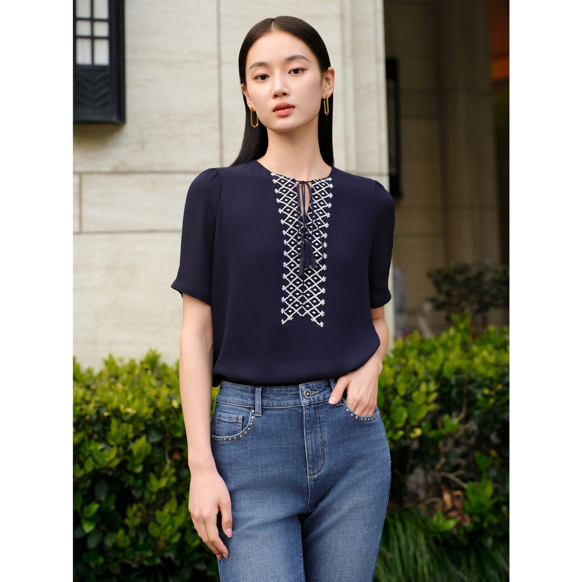 玖姿旗下安娜蔻系列民族风绣花简约轻薄宽松雪纺上衣夏季 058700
