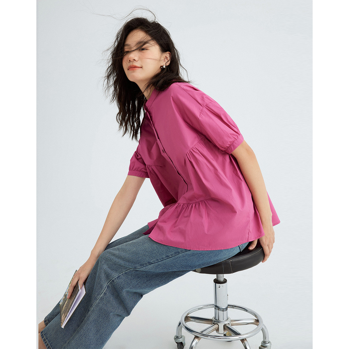 【吸睛玫紫色衬衫】夏款显白小众时髦造型感捏褶下摆衬衫 547330