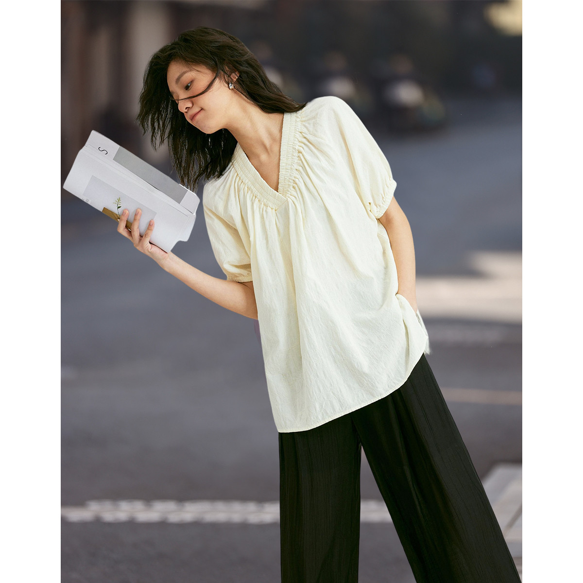 【温柔感奶杏色衬衫】夏款宽橡筋边V领提花套头小衫女 294786