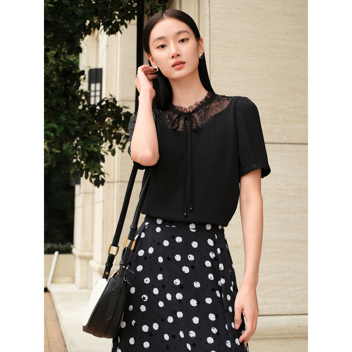 玖姿旗下安娜蔻系列优雅淑女拼接蕾丝木耳边雪纺衫上衣夏季 911244