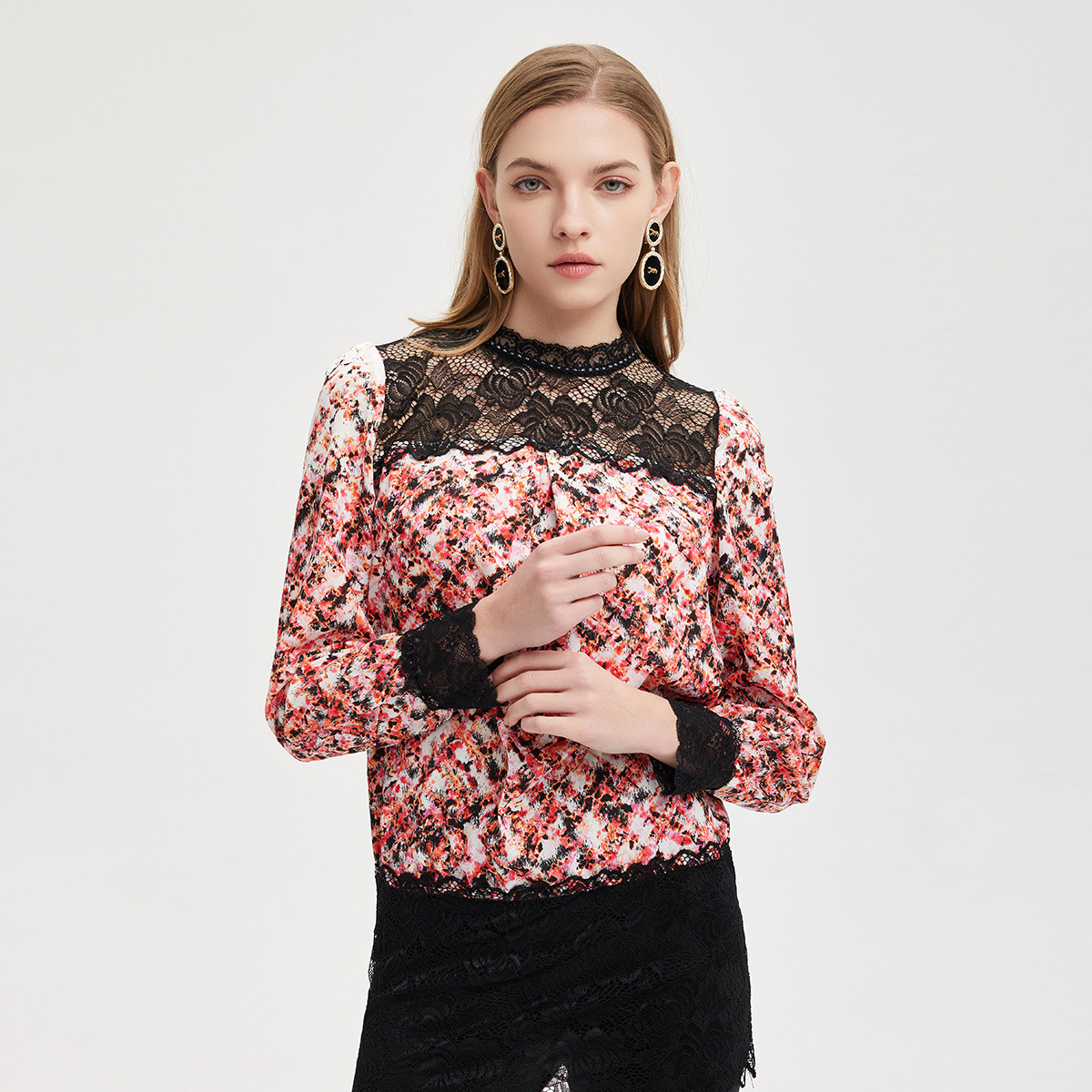 春季浪漫碎花印花袖口领口下摆蕾丝拼接温柔气质上衣 080543