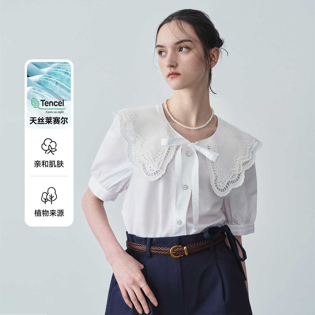 小熊女装夏装蕾丝娃娃领短袖衬衫设计感上衣 050753