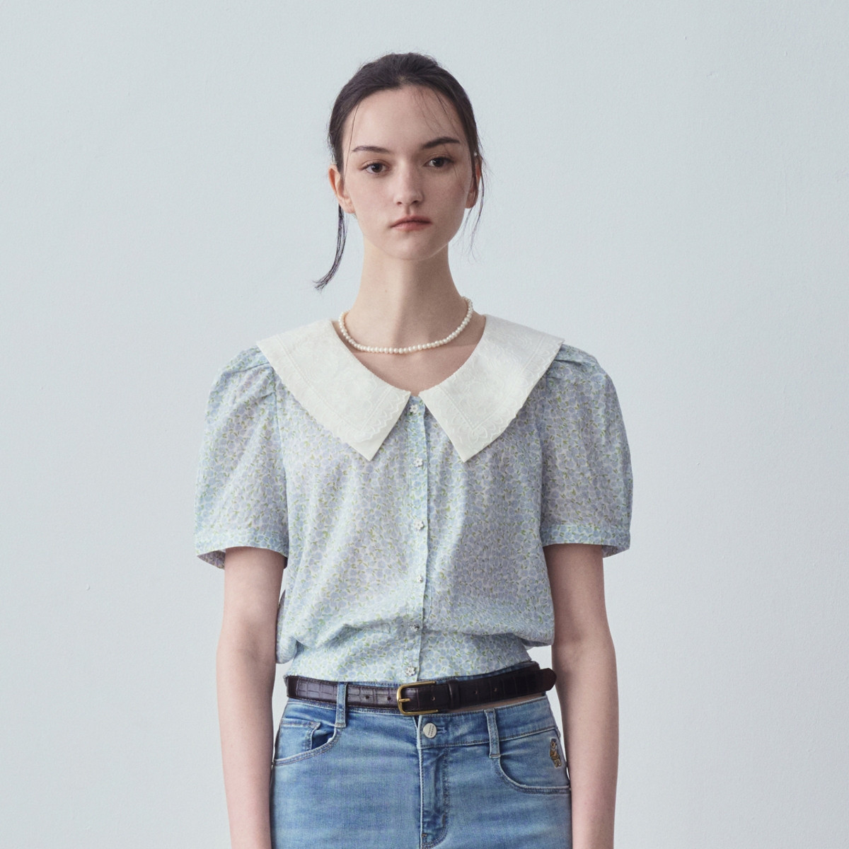 小熊夏装蕾丝双层领短袖衬衫清新碎花上衣女士 292097