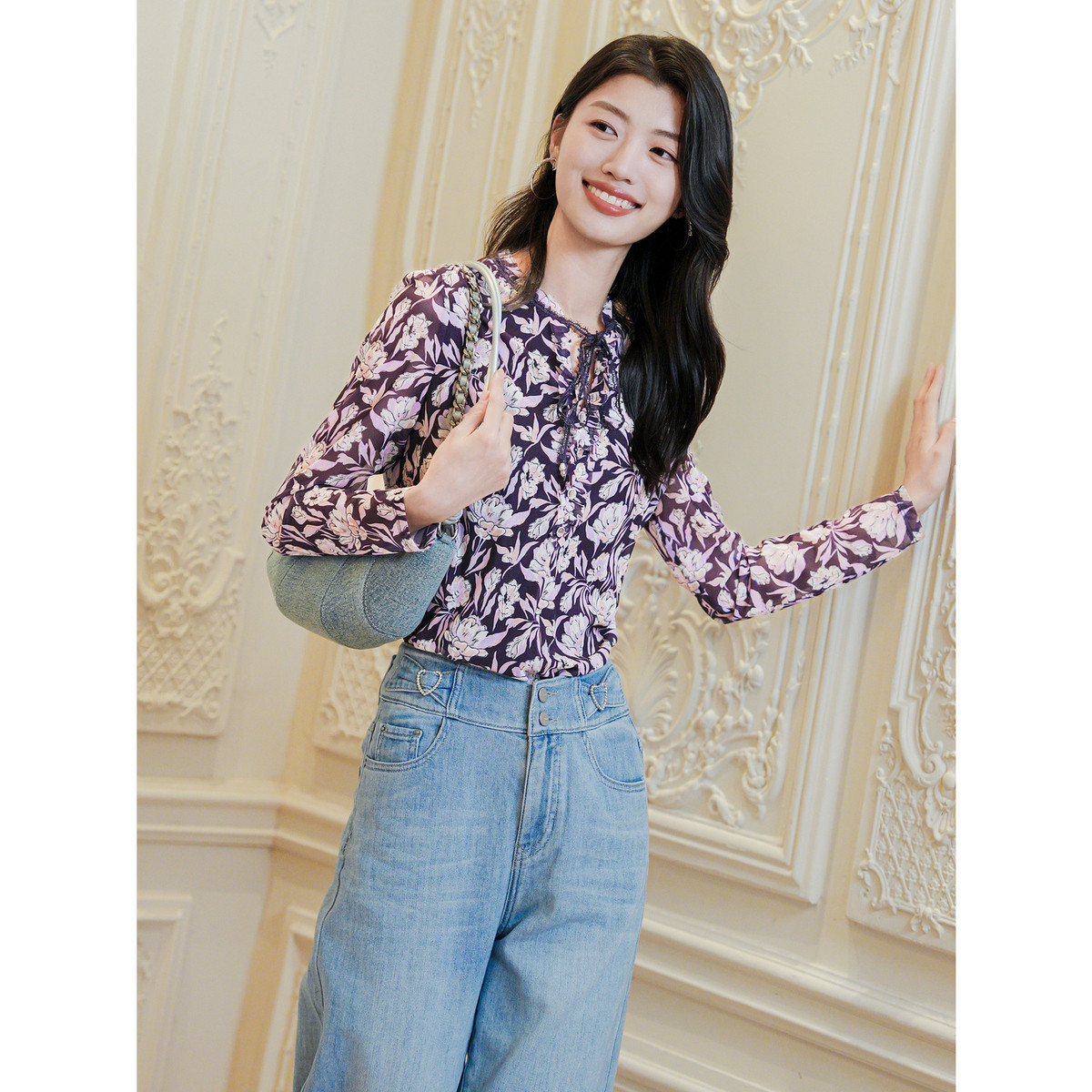 玖姿旗下安娜蔻系列V领优雅法式复古X型雪纺印花长袖上衣女秋季 906892