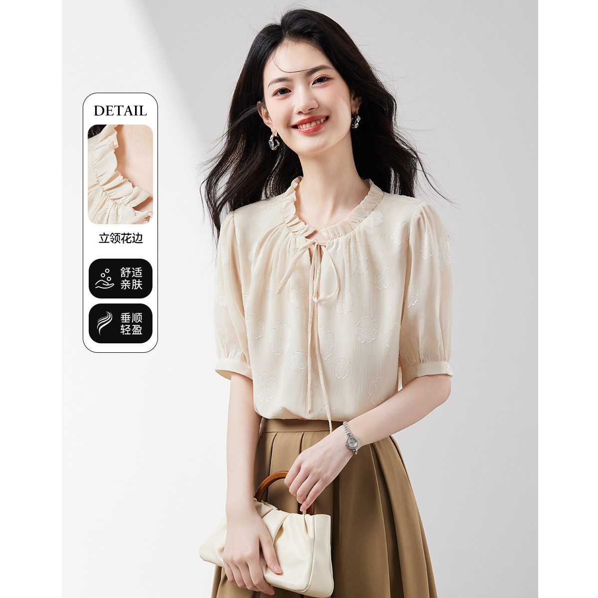 荷叶边立领短袖衬衫女夏季薄款时尚镂空设计气质纯色衬衣 870467