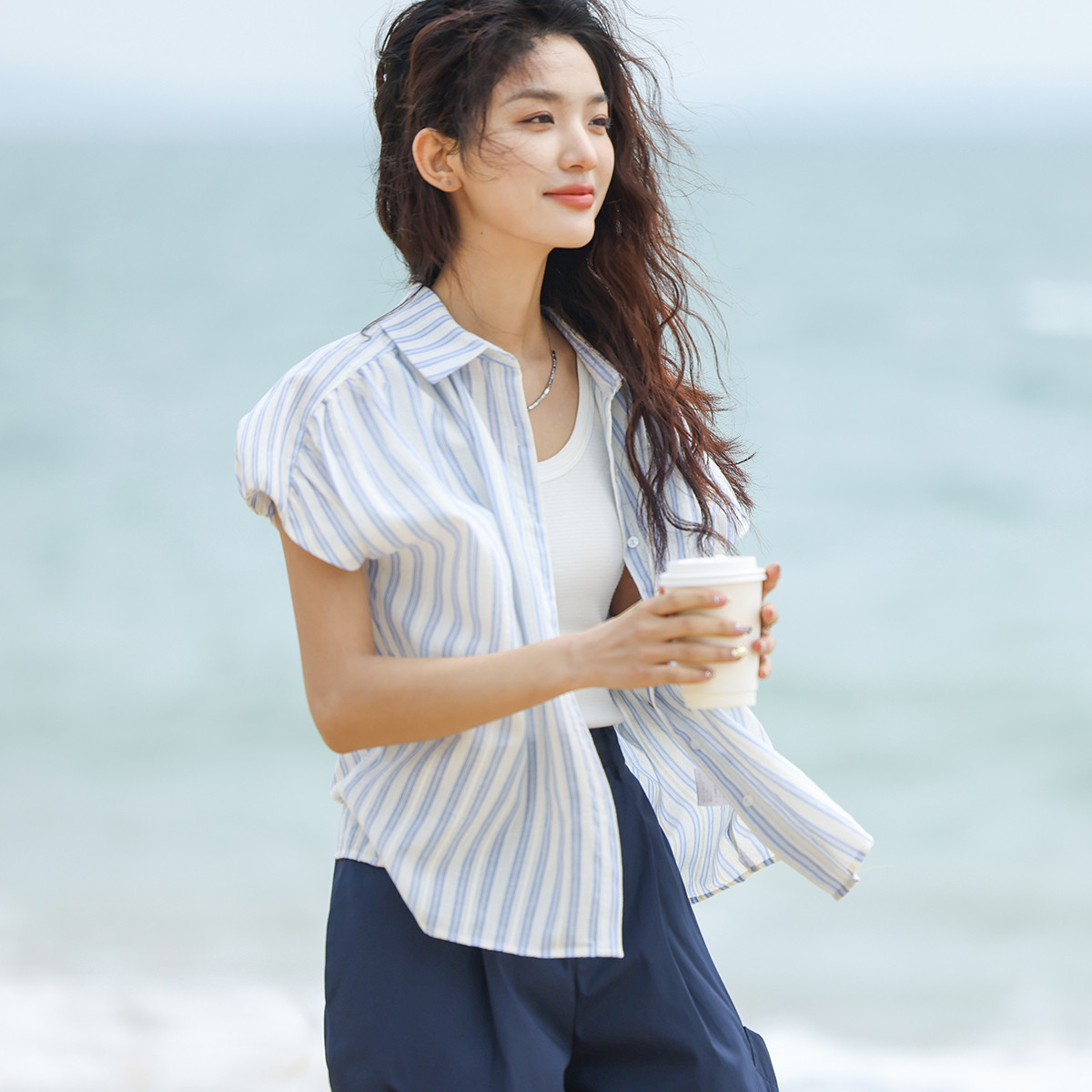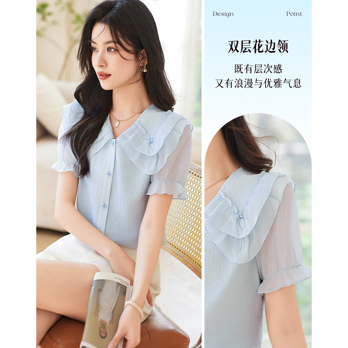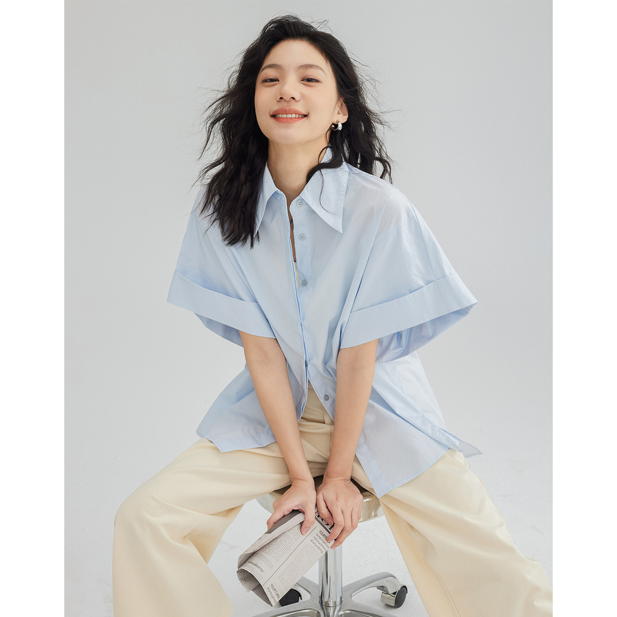 【空气蓝短袖衬衫】夏款学院风宽翻边袖造型感氧气衬衣女 845378