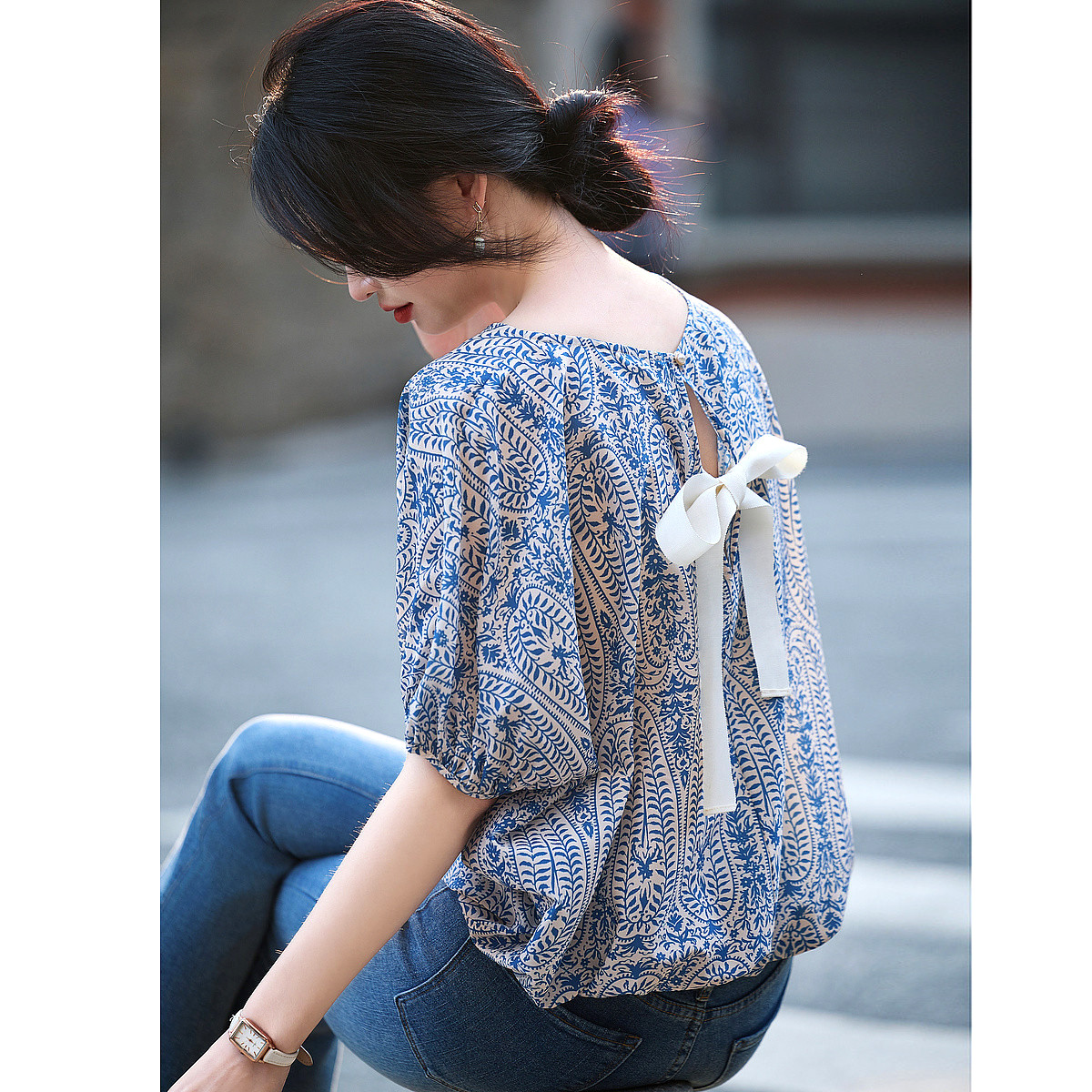 【艺术感后背镂空系带】夏文艺印花衬衫灯笼袖舒适遮肉衬衣女上衣 351937