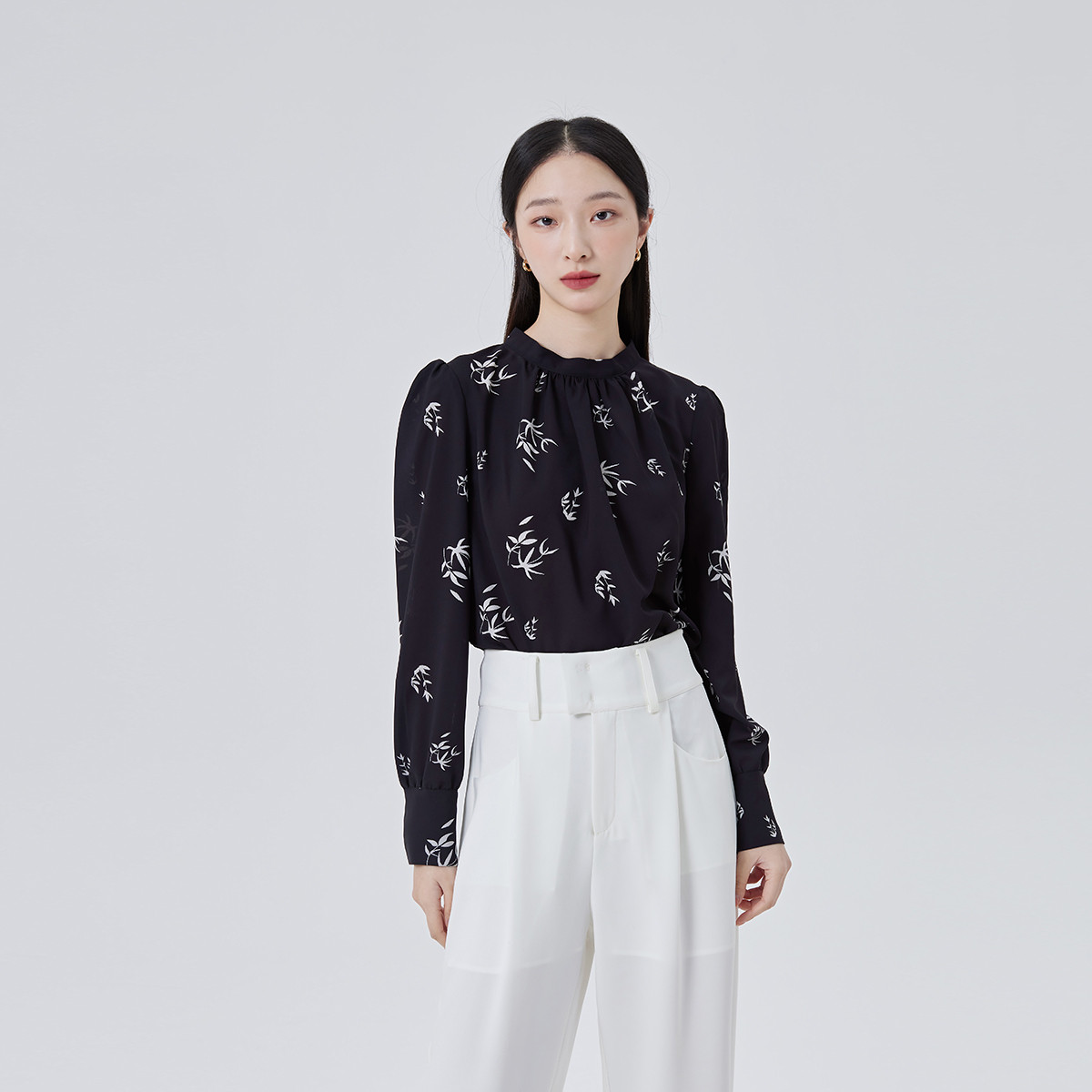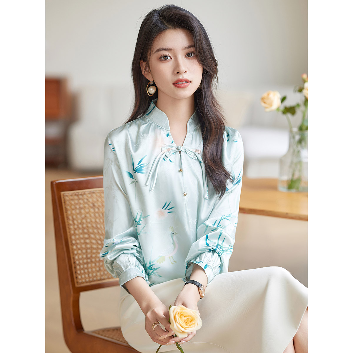 新中式国风复古印花立领女式衬衫女春季气质简约长袖衬衣 495768