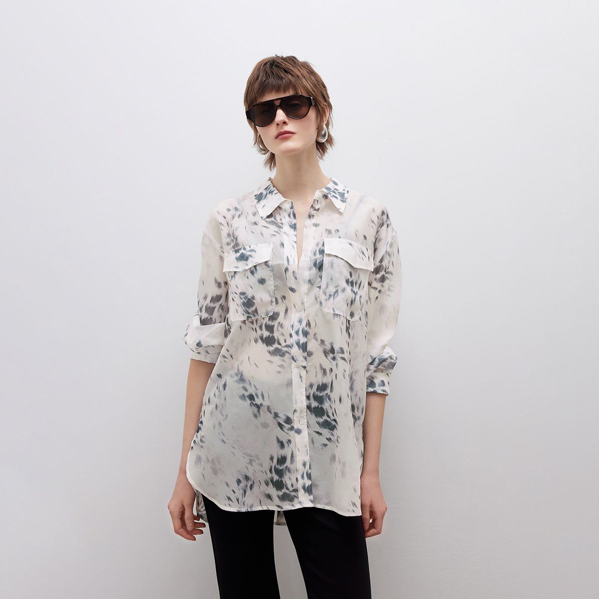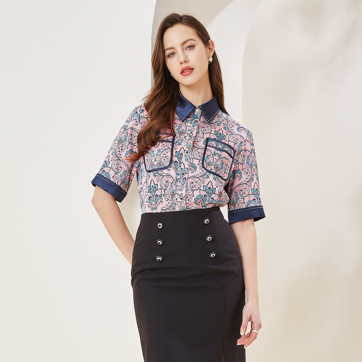 商场同款春季复古巴洛克印花撞色滚边贴袋宽松翻领衬衣 475551
