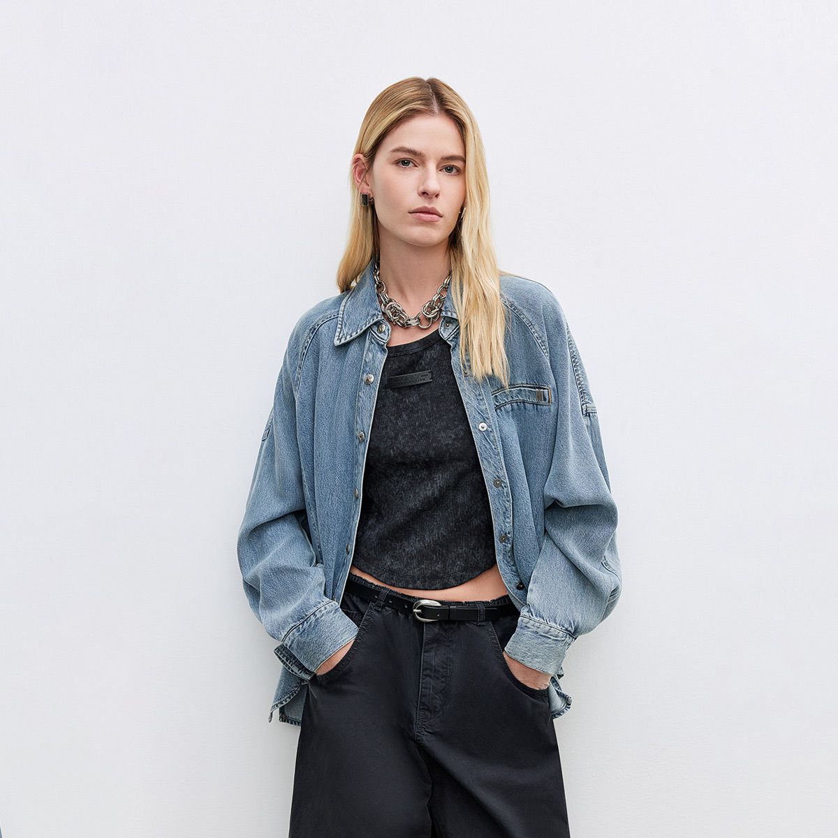【牛仔衬衫】25夏季含莱赛尔落肩宽松翻领牛仔衬衫女 043034