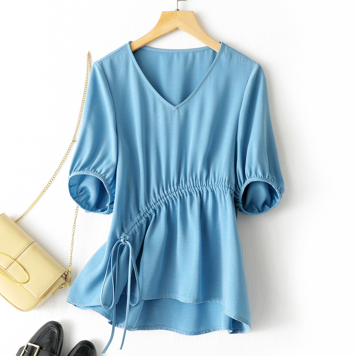 2025夏新款别致设计感宽松百搭V领松紧腰小衫高级感抽绳衬衫 573449