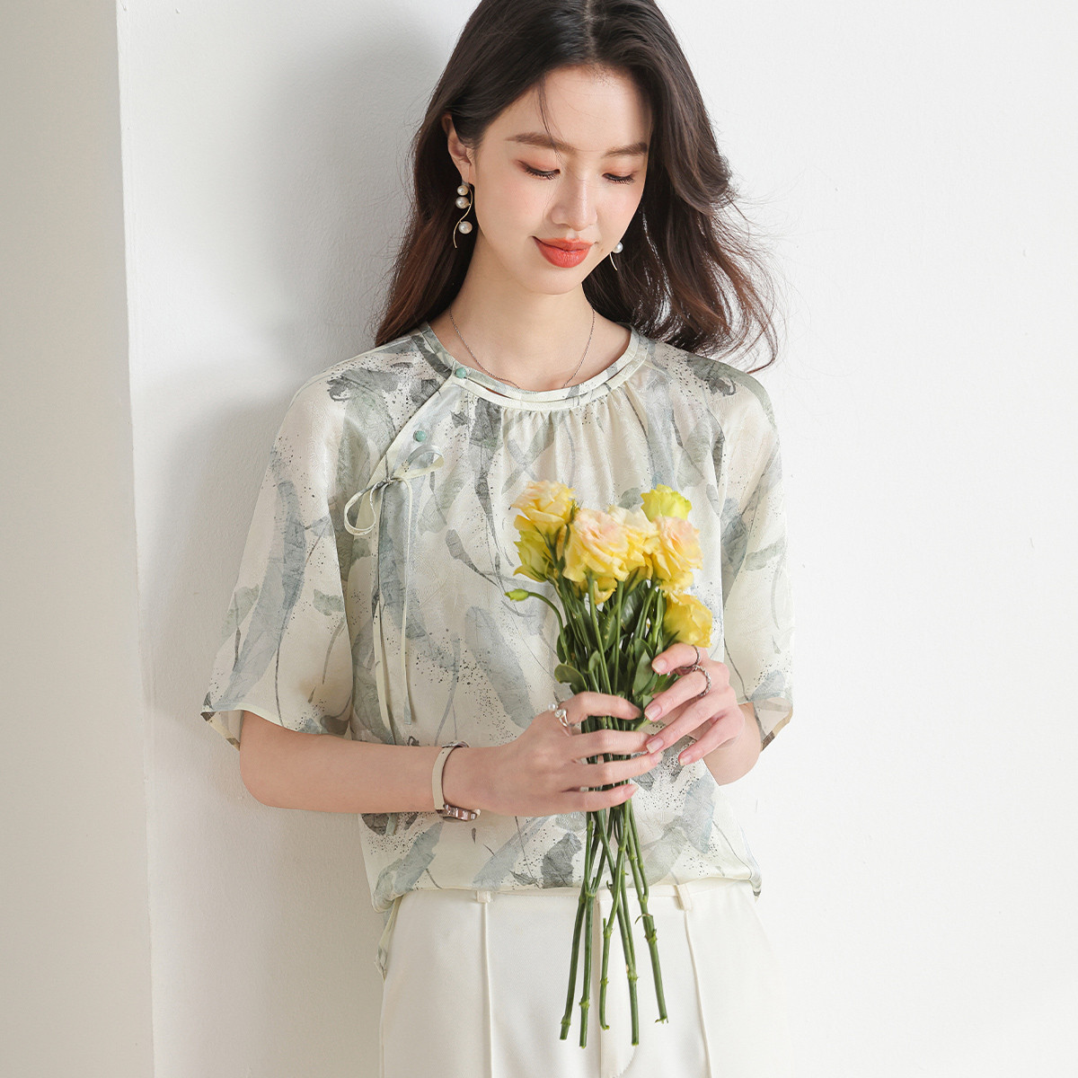 轻薄透气含桑蚕丝圆领印花斜襟衬衫休闲时尚短袖T恤夏季国风小衫 165715