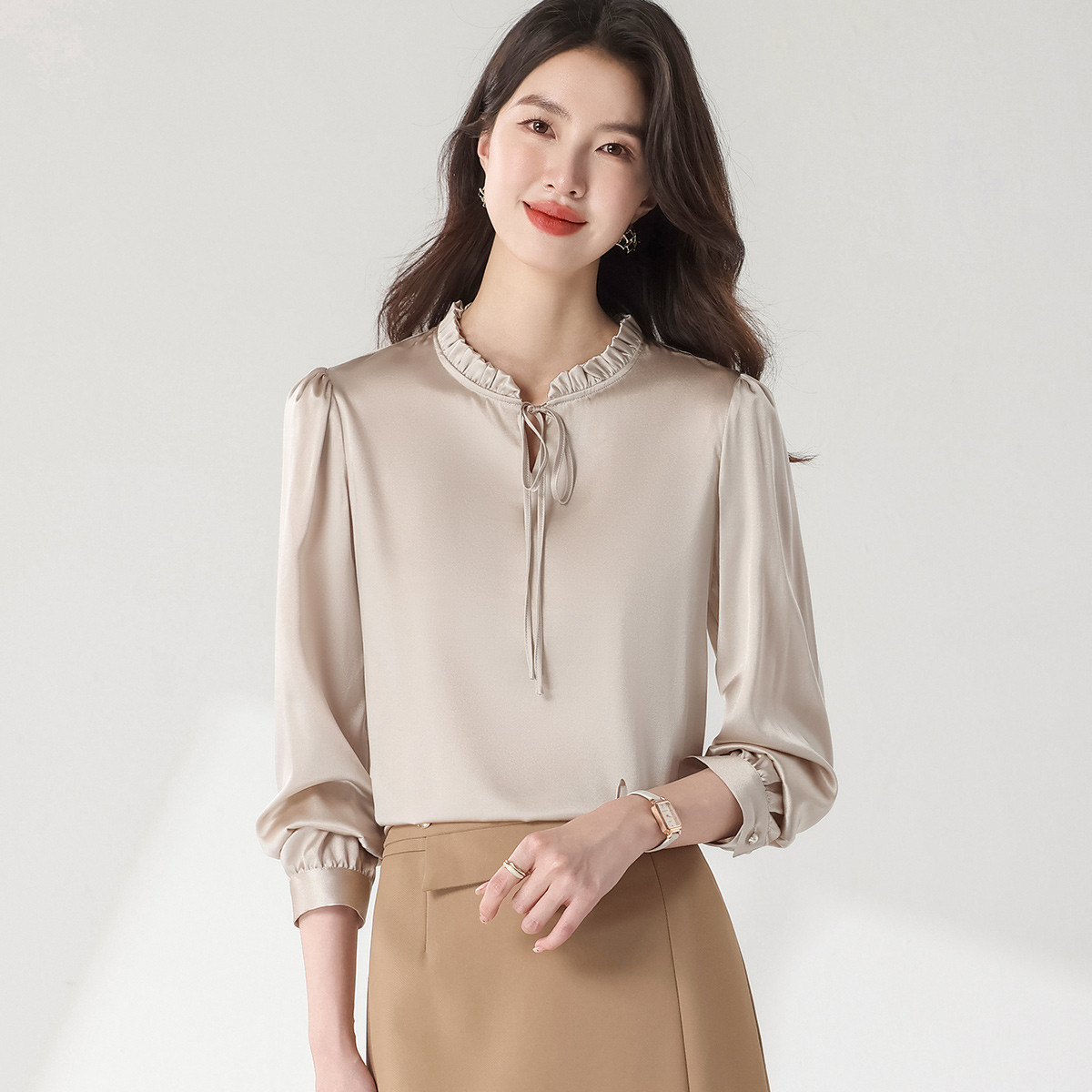 优雅淑女荷叶领纯色桑蚕丝衬衫女长袖衬衣春夏高级感上衣套头 486867