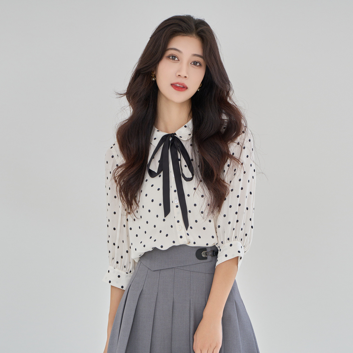 减龄娃娃领衬衫女通勤百搭小众气质上衣法式波点七分袖衬衣女 680963