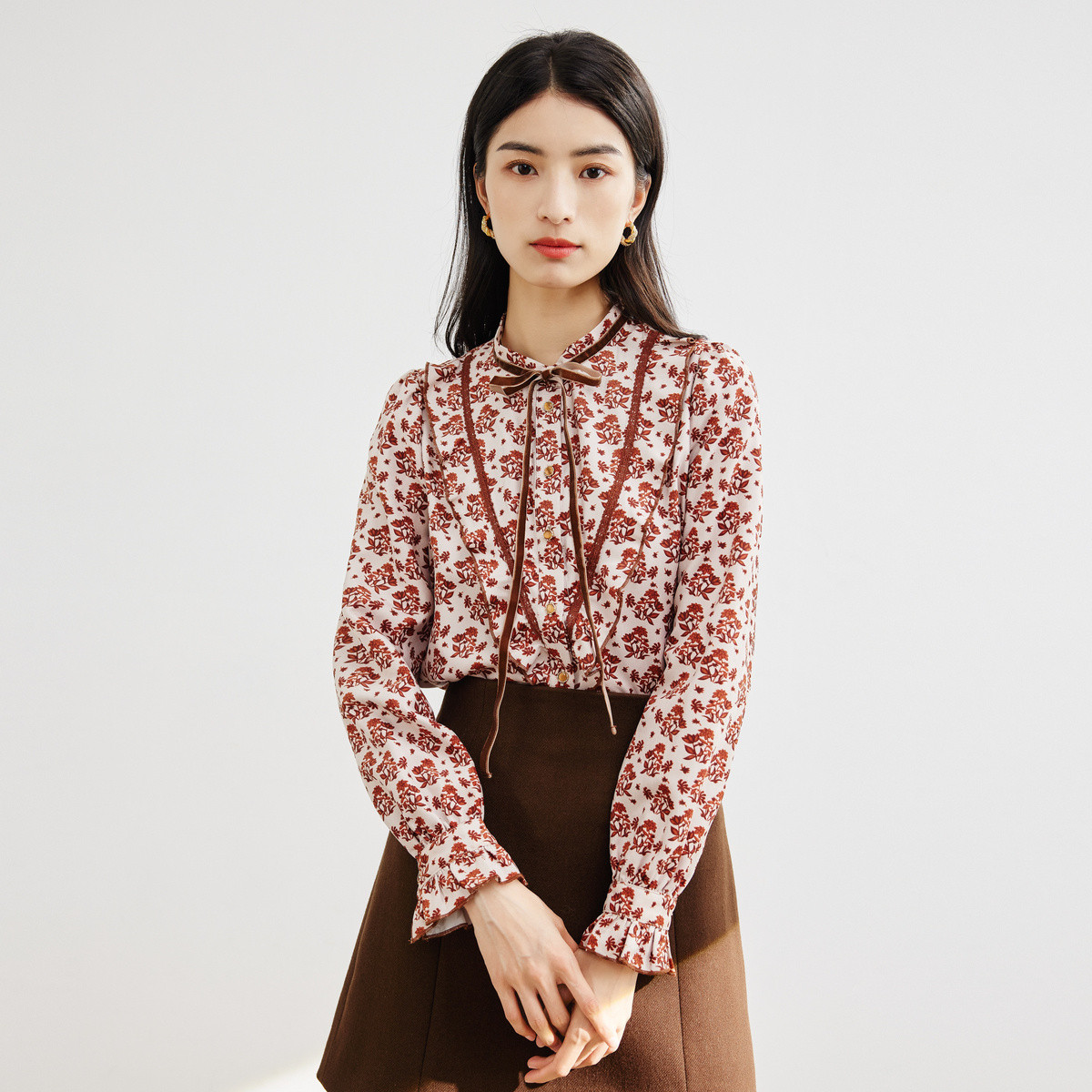 时尚气质浪漫碎花长袖衬衫女春秋设计感荷叶边飘带领结通勤衬衣女 418819