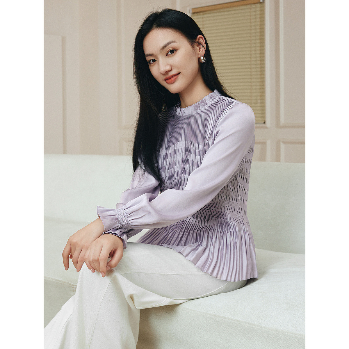 旗下安娜蔻系列优雅简约风琴压褶木耳边修身长袖上衣女春季 846476