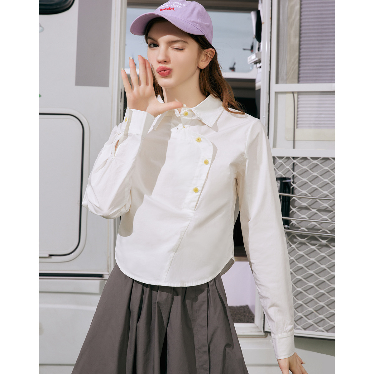【100%棉】个性斜门襟设计开叉女式衬衫春季上衣 377629