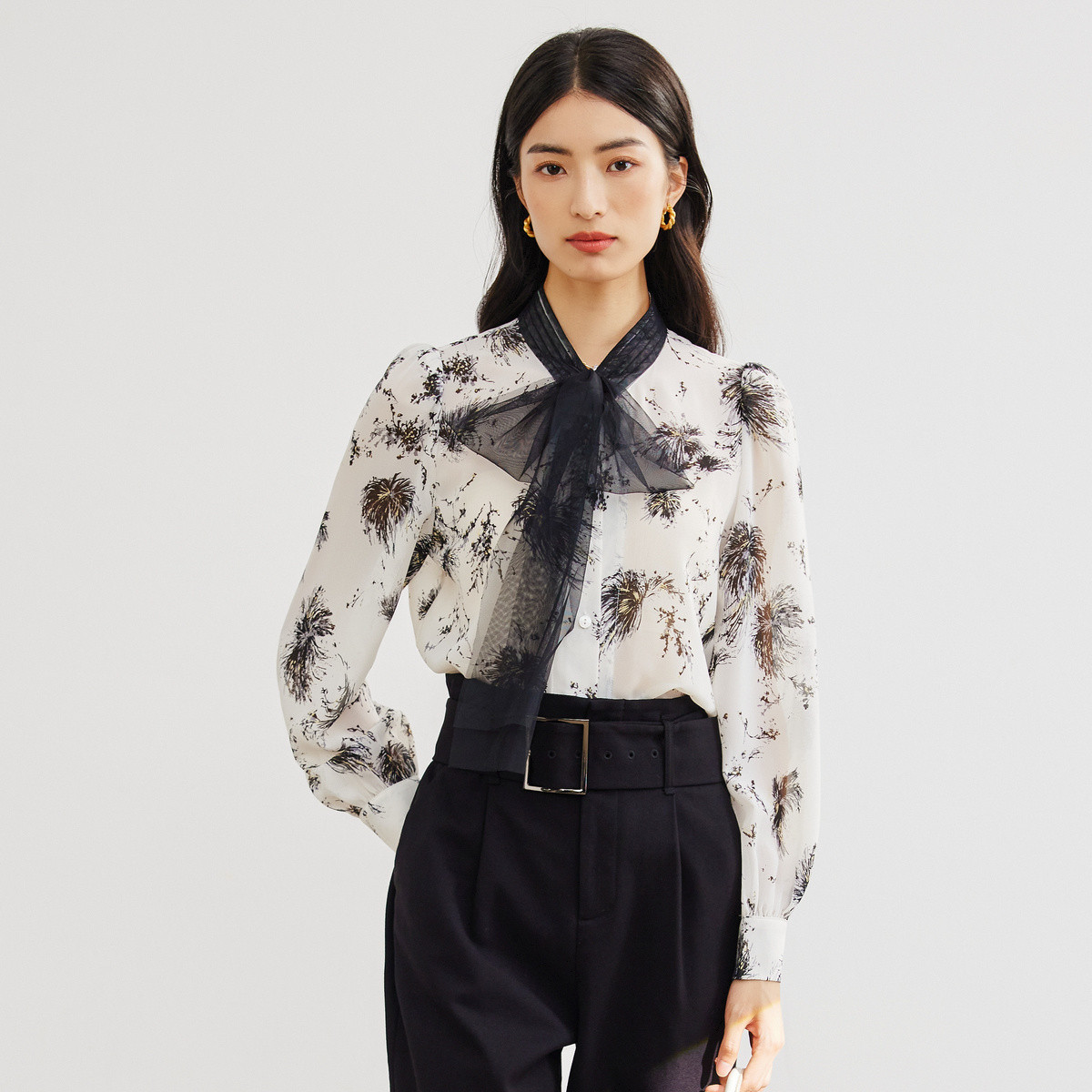 国风水墨画长袖衬衫女时尚独特设计感通勤系带蝴蝶结衬衣女 582659