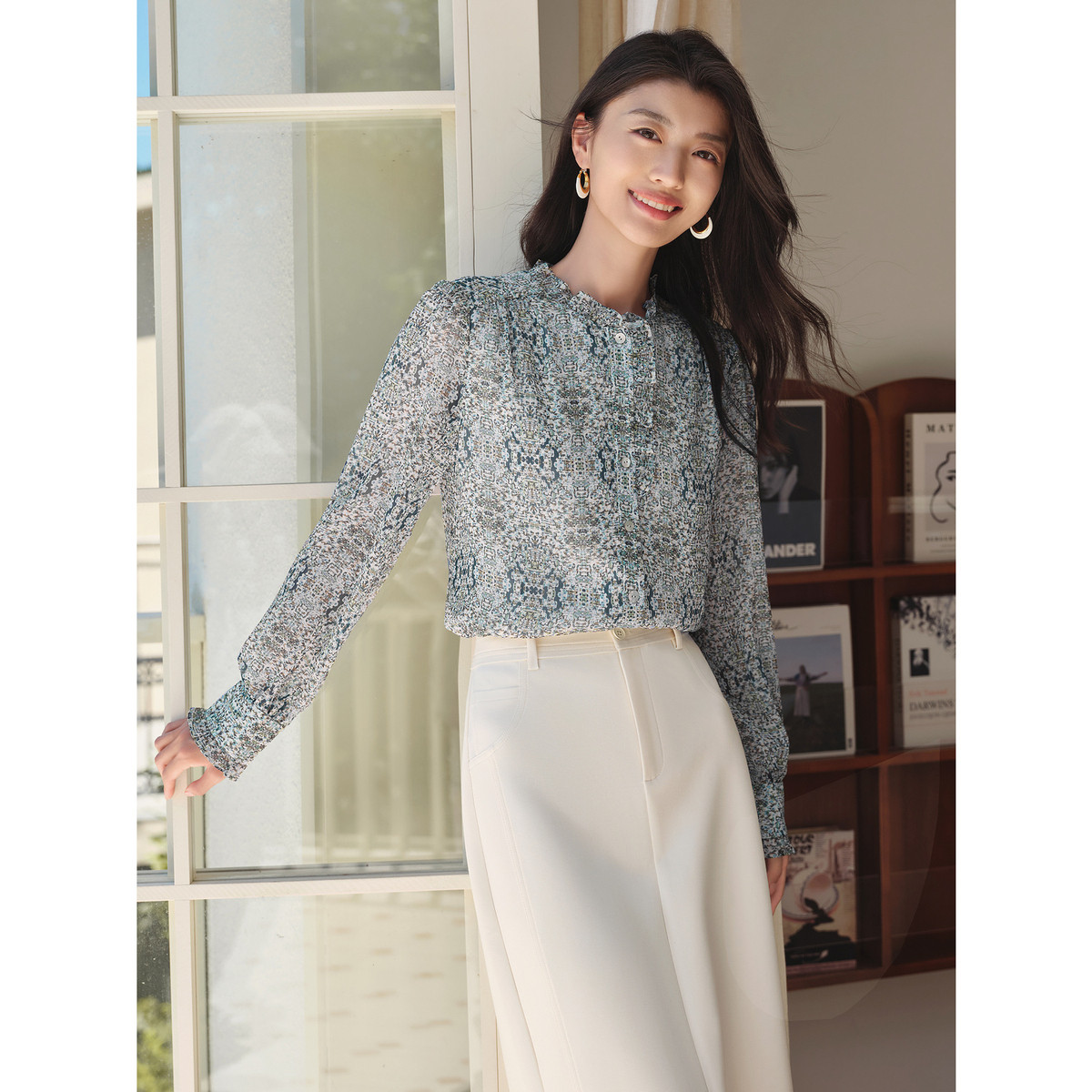 玖姿旗下安娜蔻系列浪漫木耳边肌理雪纺长袖印花衬衫女春季 725580
