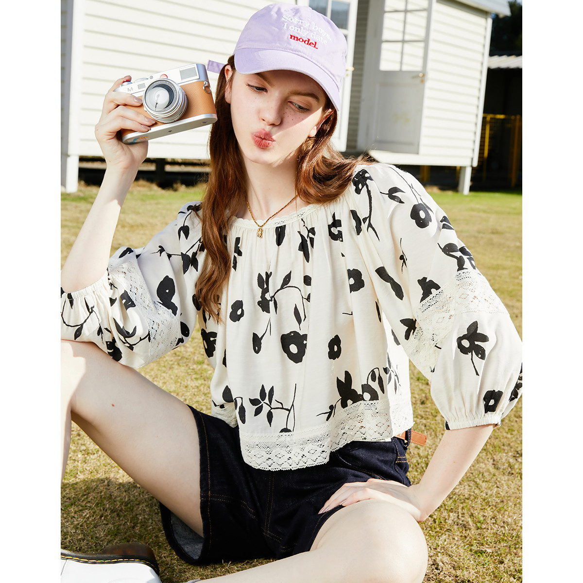 印花蕾丝拼接宽松小衫气质法式复古半袖春季女式衬衫 088989