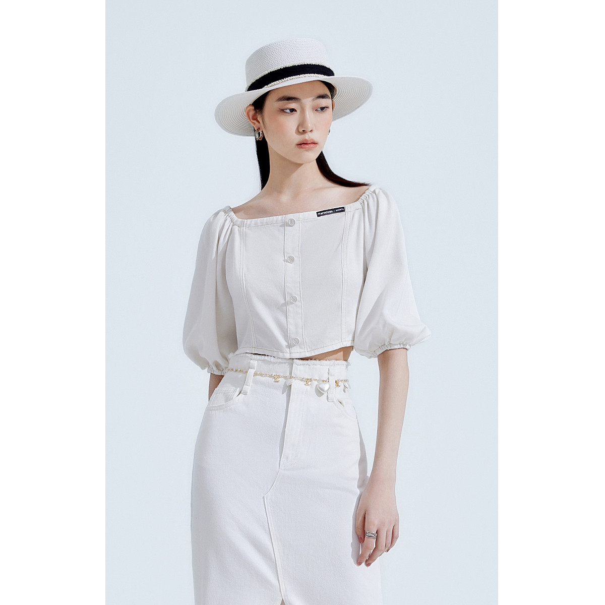 CHUU露肩雪纺衫女夏褶皱镂空拼接泡泡袖短款上衣 789907