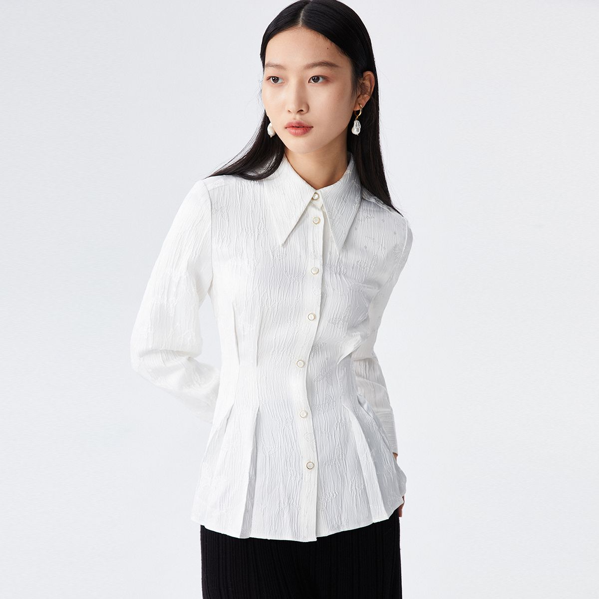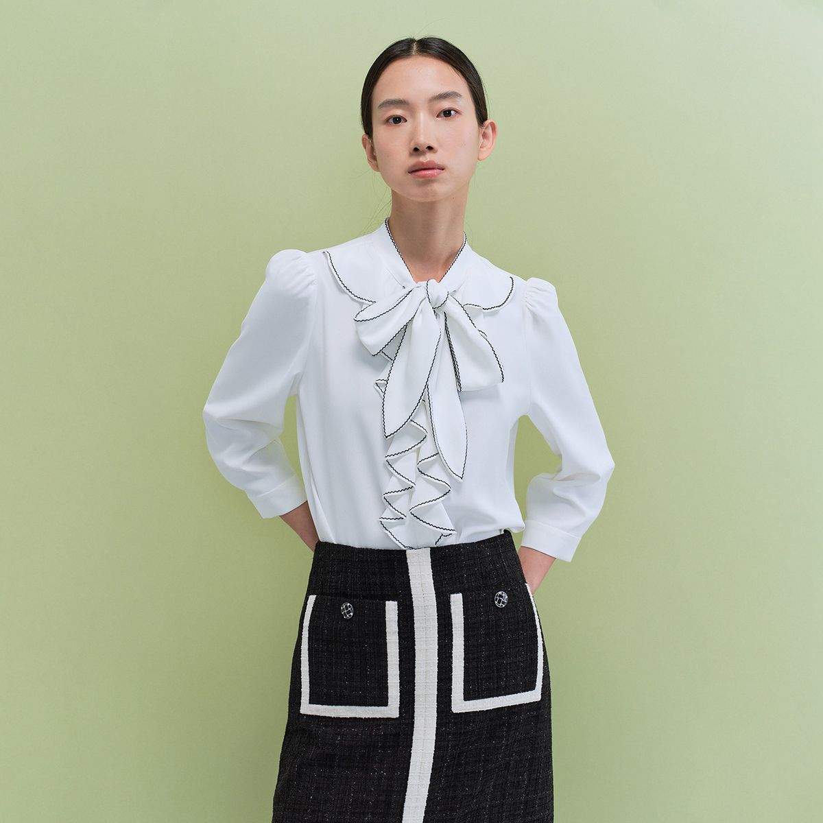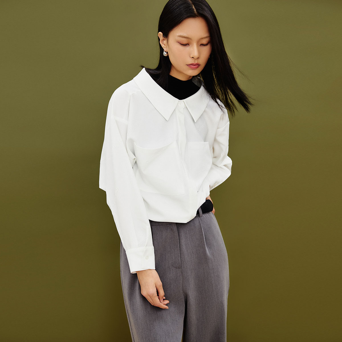 玖姿旗下安娜蔻系列通勤简约羊毛混纺刺绣上衣衬衫女春季 021836