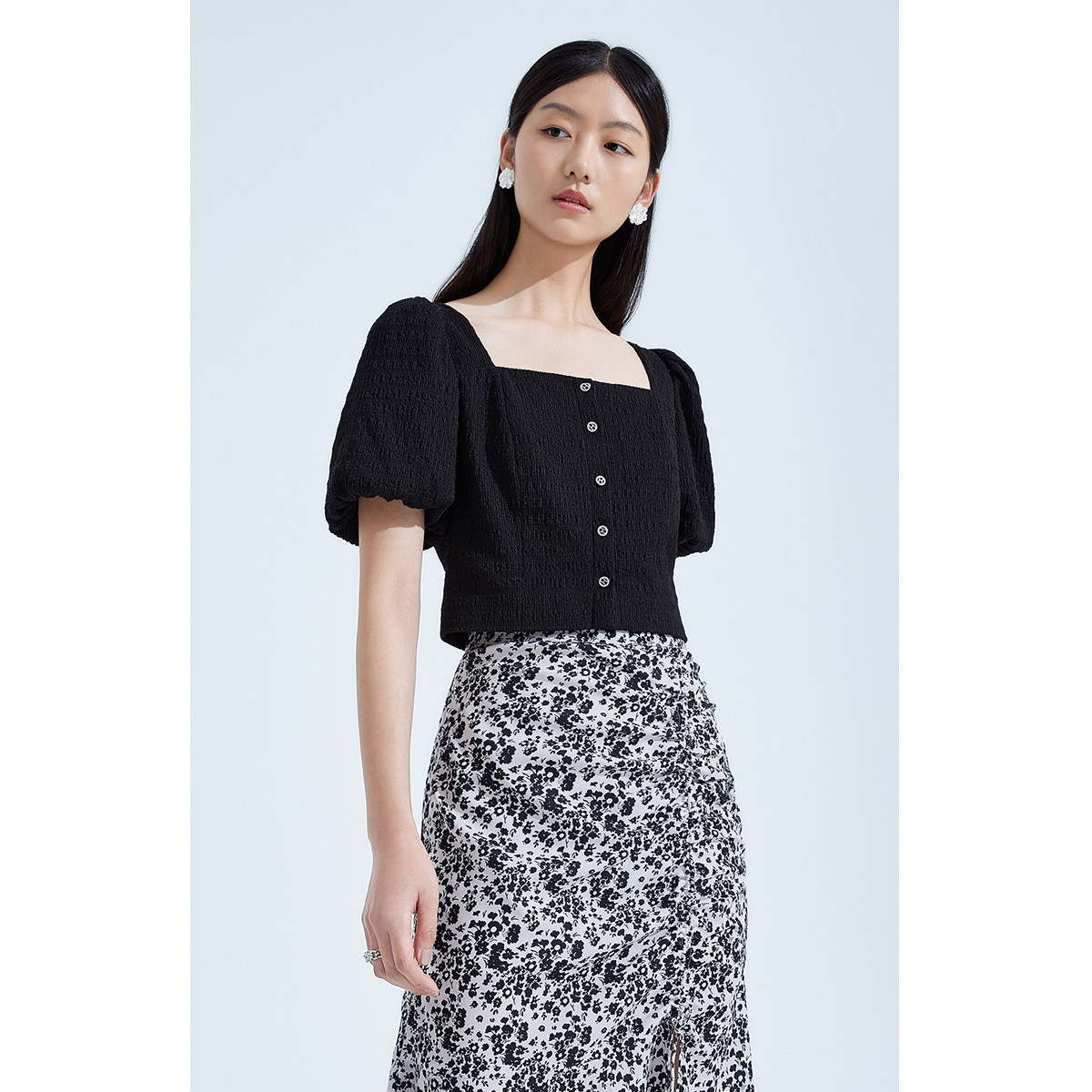 黑标系列 夏装饰扣方领泡泡袖短款短袖衬衫女 459855