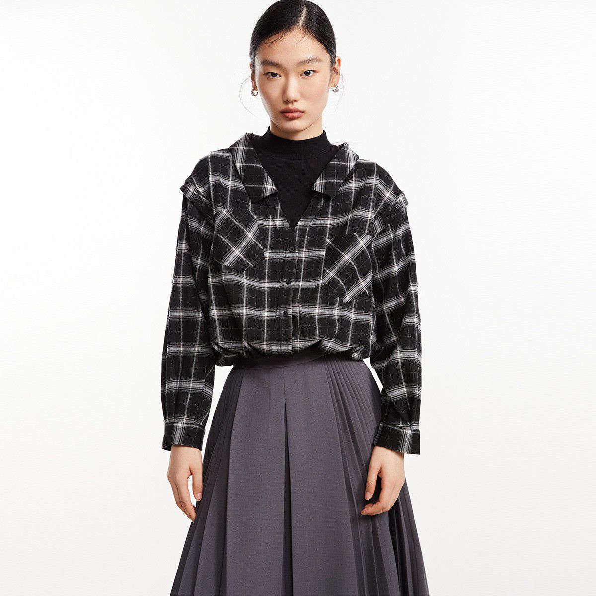 雪纺衫衬衫女假两件格子衫落肩休闲百搭 381265