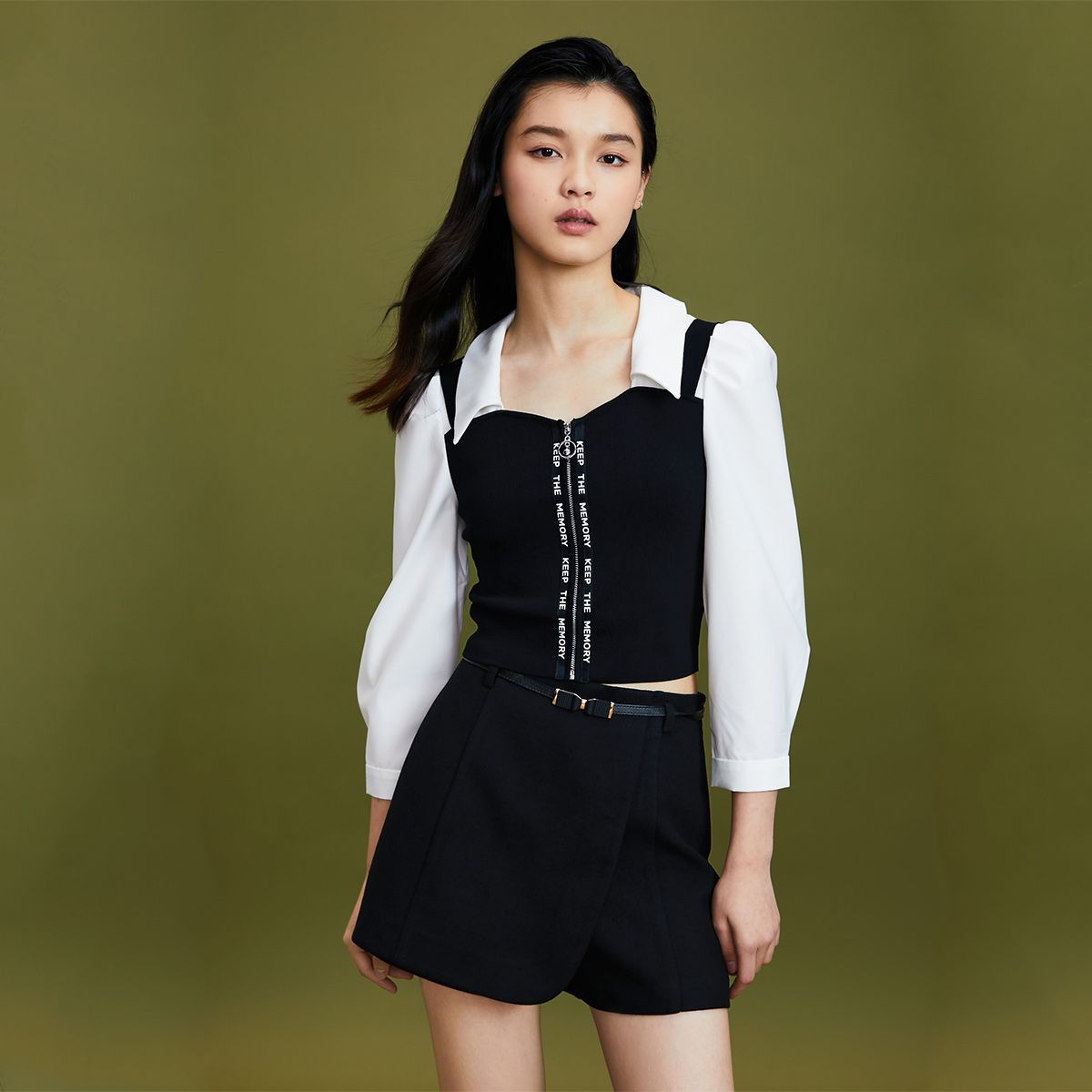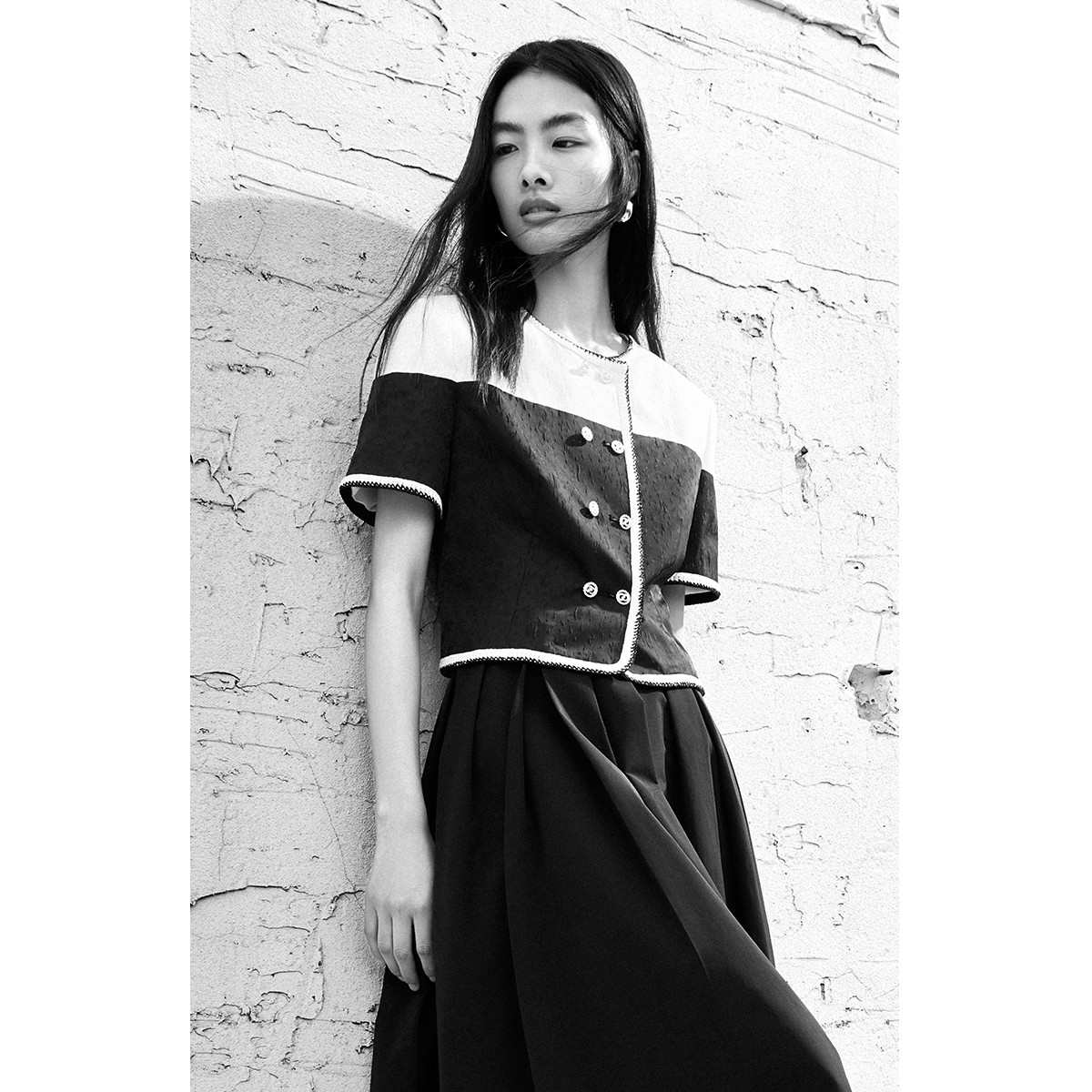 黑标系列夏装 粗编织带小香风撞色短款短袖衬衫女 687247