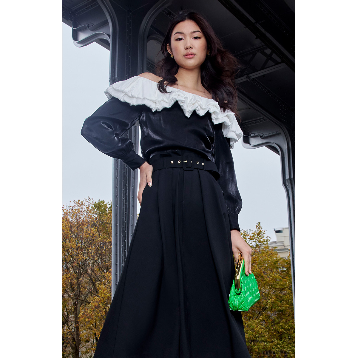 黑标系列春装 荷叶边亮丝露肩上衣一字领衬衫女 266703