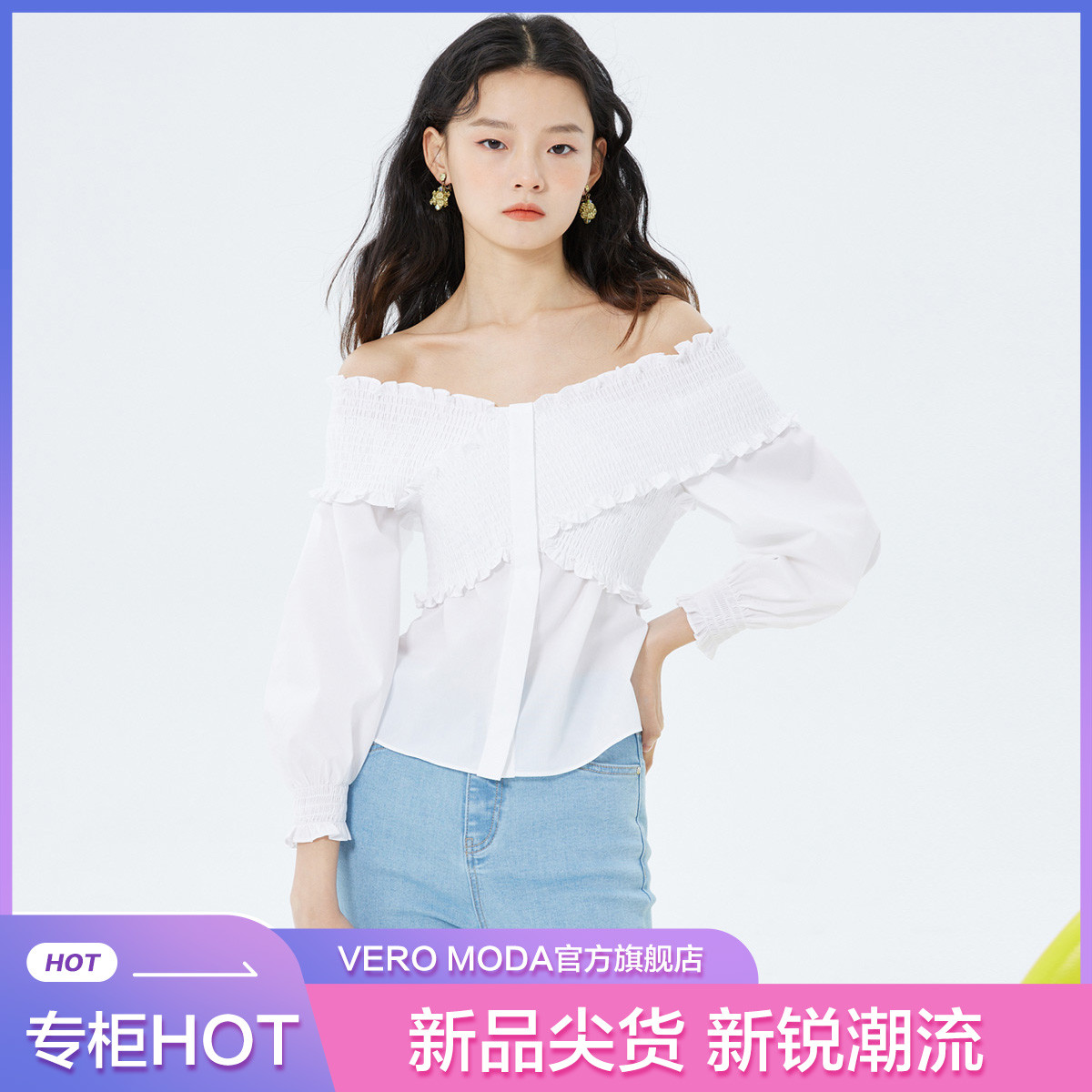 CHUU露肩雪纺衫女夏褶皱镂空拼接泡泡袖短款上衣 789907