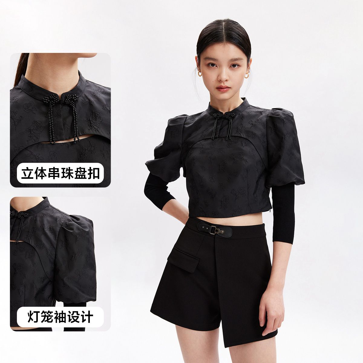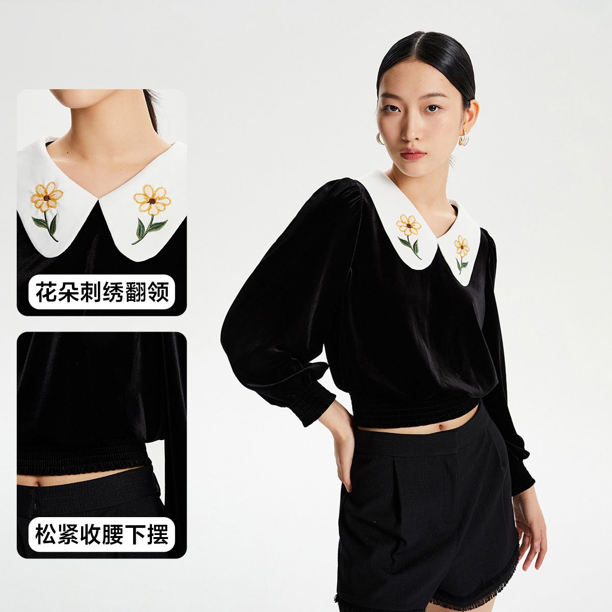 【秋专柜款】黑色丝绒花朵刺绣七分灯笼袖甜美减龄上衣女 822097