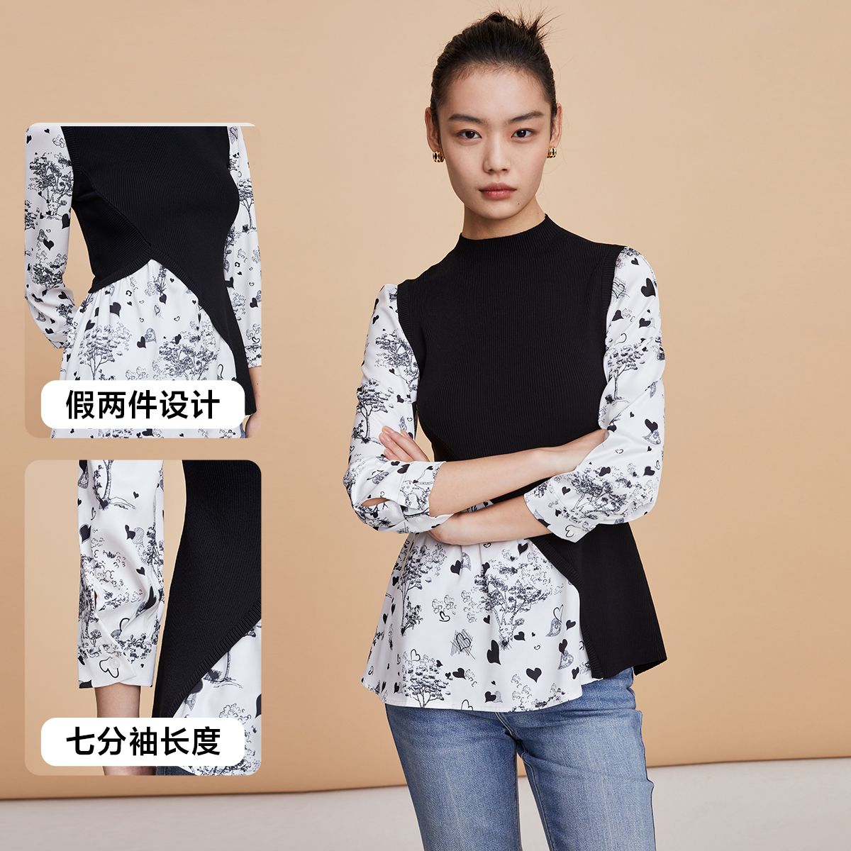 上衣女衬衫七分袖拼接针织衫假两件 824977