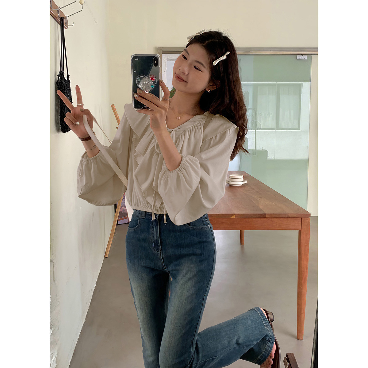法式V领荷叶边衬衫女气质温柔长袖上衣 320003