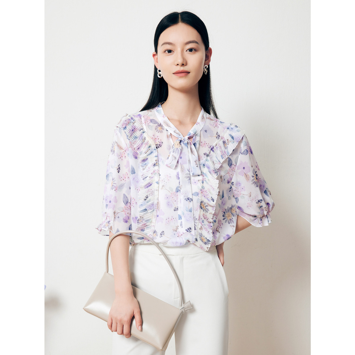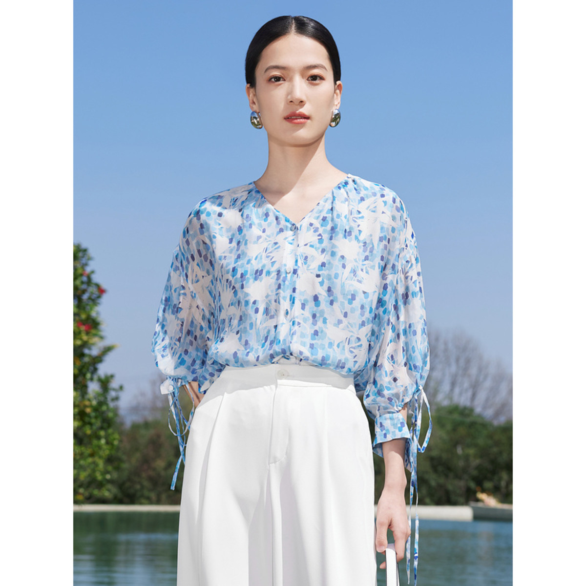 玖姿旗下安娜蔻系列轻熟优雅风印花宽松雪纺一手长套头衫女夏季 535884