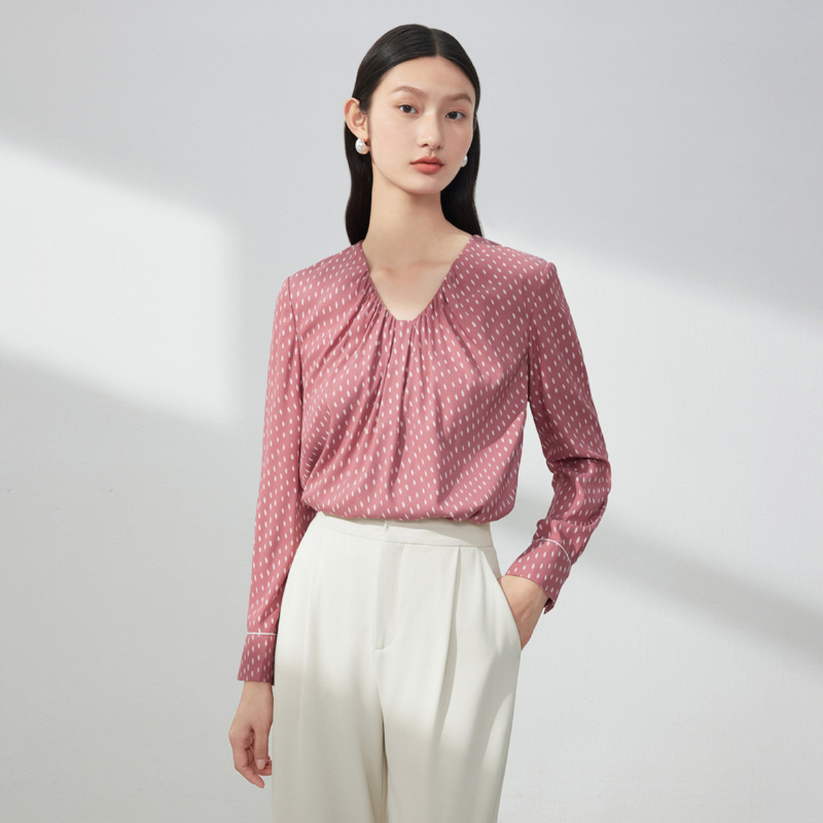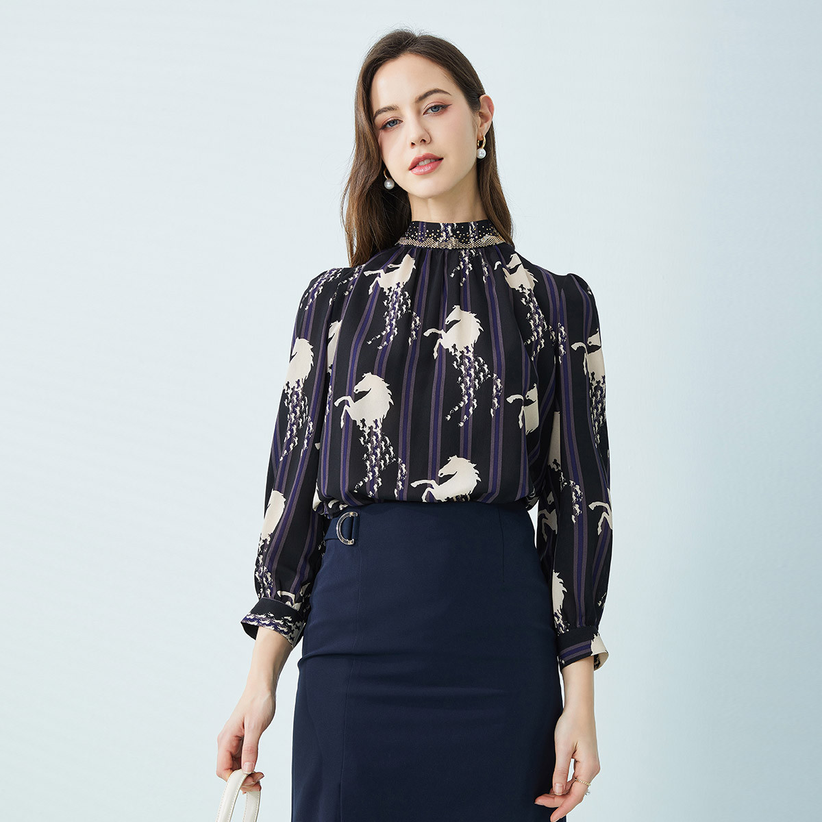商场同款春优雅飞马撞色印花立领微褶皱烫钻雅致长袖衬衣 940127