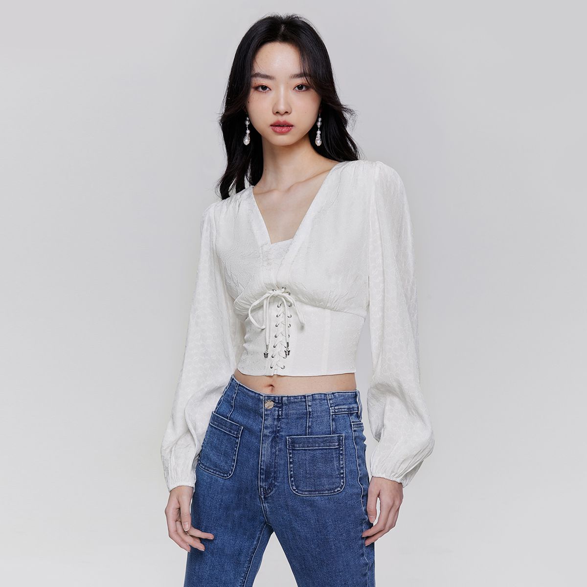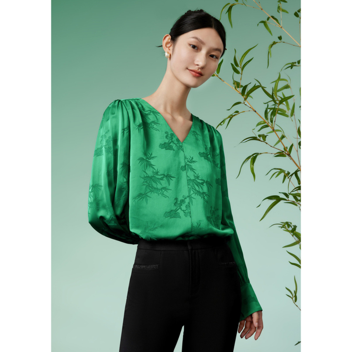 【国风系列】玖姿气质V领薄荷曼波衬衫女装春秋小众肌理小衫 063820