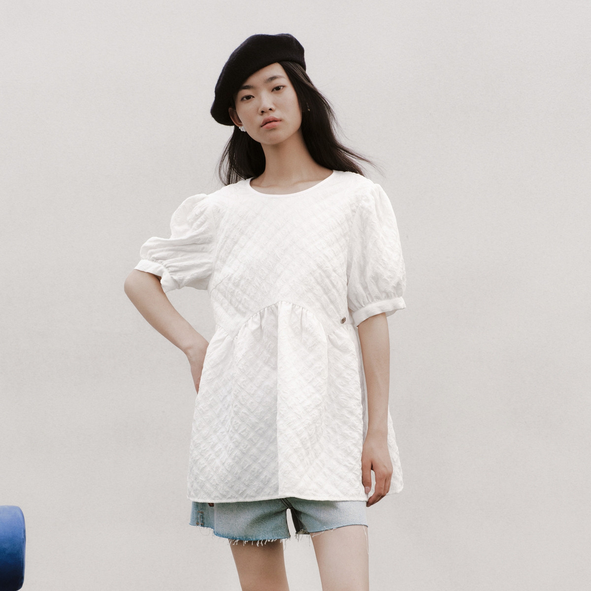 CHUU露肩雪纺衫女夏褶皱镂空拼接泡泡袖短款上衣 789907