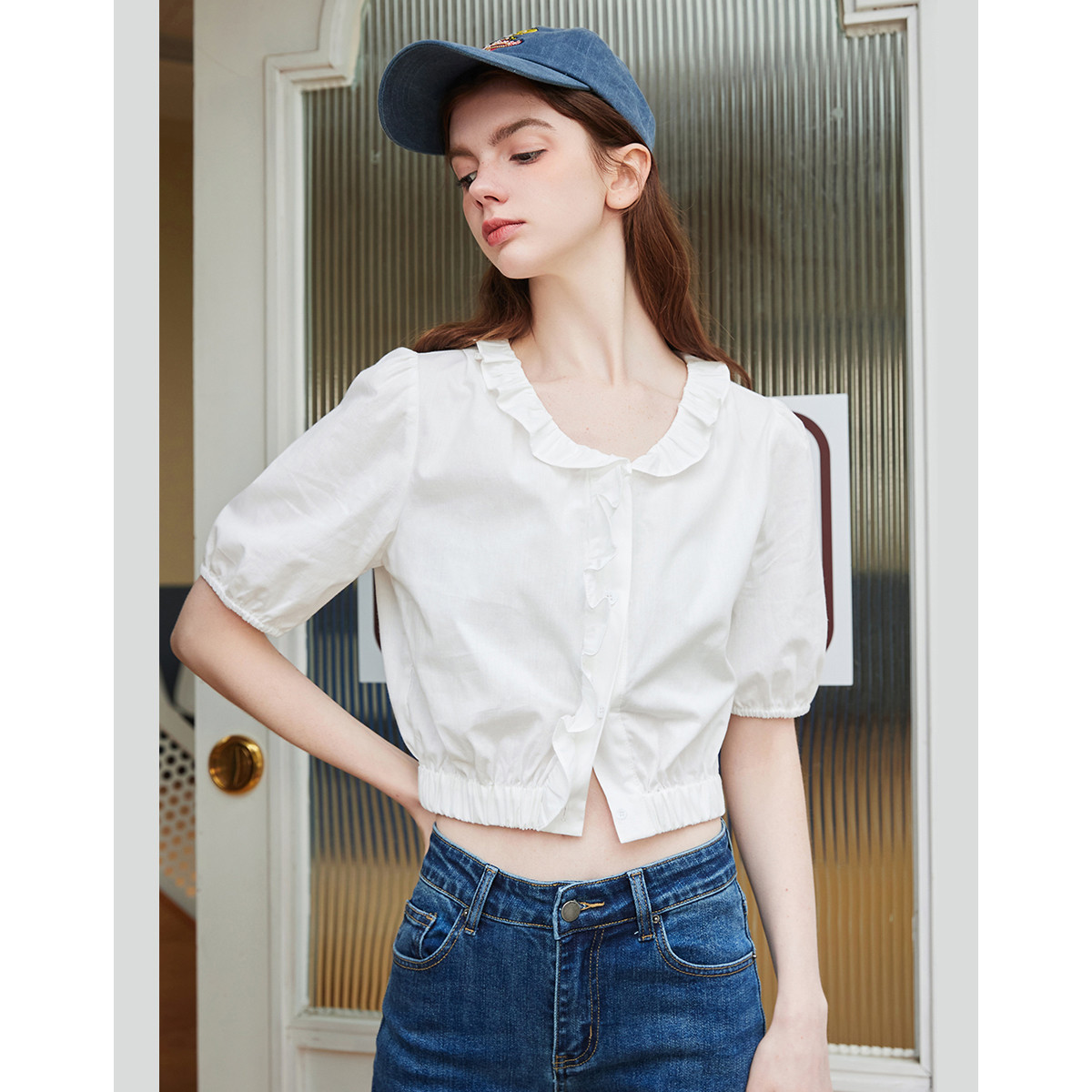 【100%棉】夏季法式复古荷叶木耳边短袖女式衬衫 297821