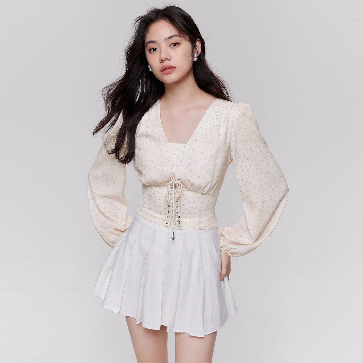 【甜美泡泡袖衬衫】夏V领木耳边碎花衬衣女装上衣 310913